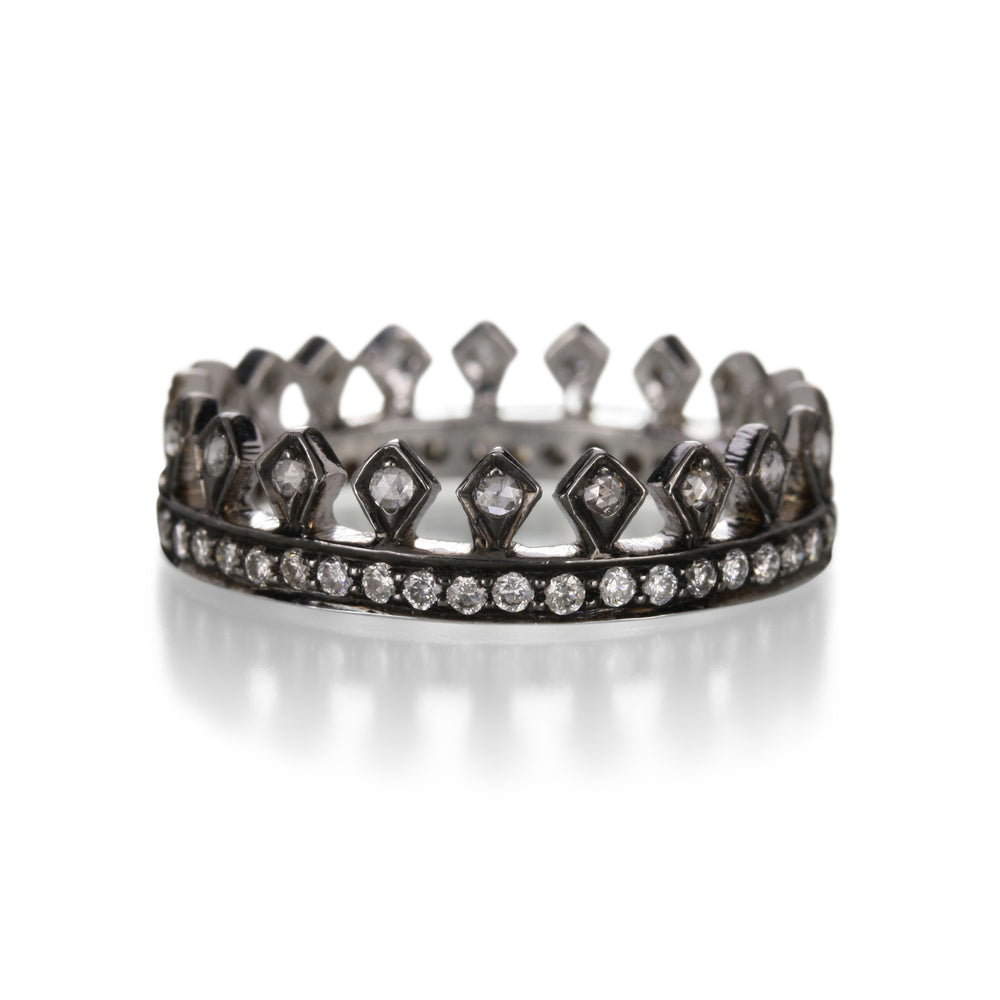 An 18k black rhodium Enchanted Garden Tiara ring with white diamonds=.52cttw. Band measures 5.1mm wide. Size 6.25. RING SIZING OPTIONS Handcrafted in Indore, India.