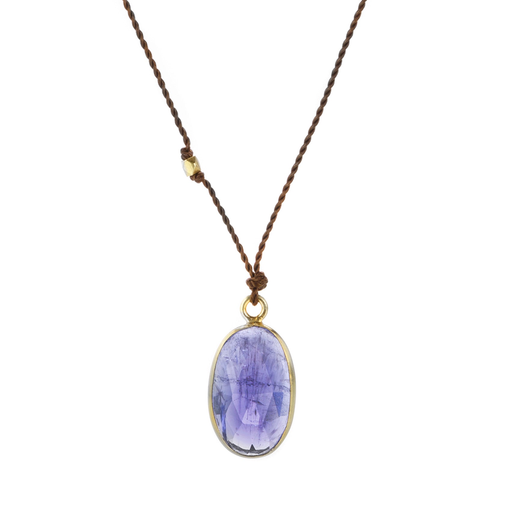 A taste of tanzanite brings unique color and versatility! This brown nylon corded necklace from Margaret Solow features a 14k yellow gold bezel set, faceted oval tanzanite pendant. Stone measures 5/8" x 3/8" on a 17" cord with a faceted gold bead accent. Handcrafted in Los Angeles, CA, U.S.