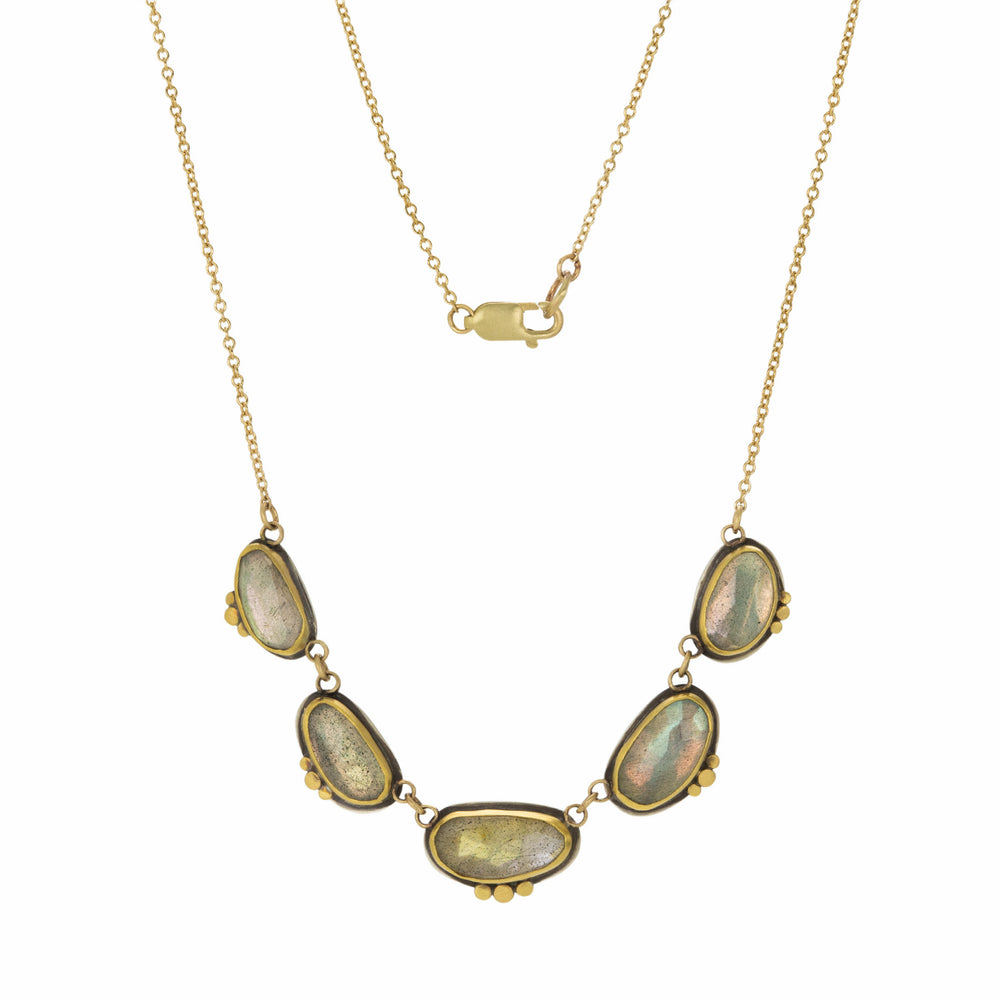 An artful marriage of gemstones and abstract form, this mixed metals necklace from Ananda Khalsa features five rose cut labradorites, set on sterling silver platforms with 22k yellow gold bezels and dot accents. Total 18k yellow gold chain length measures 16” with lobster clasp. Handcrafted in Northampton, MA, U.S.