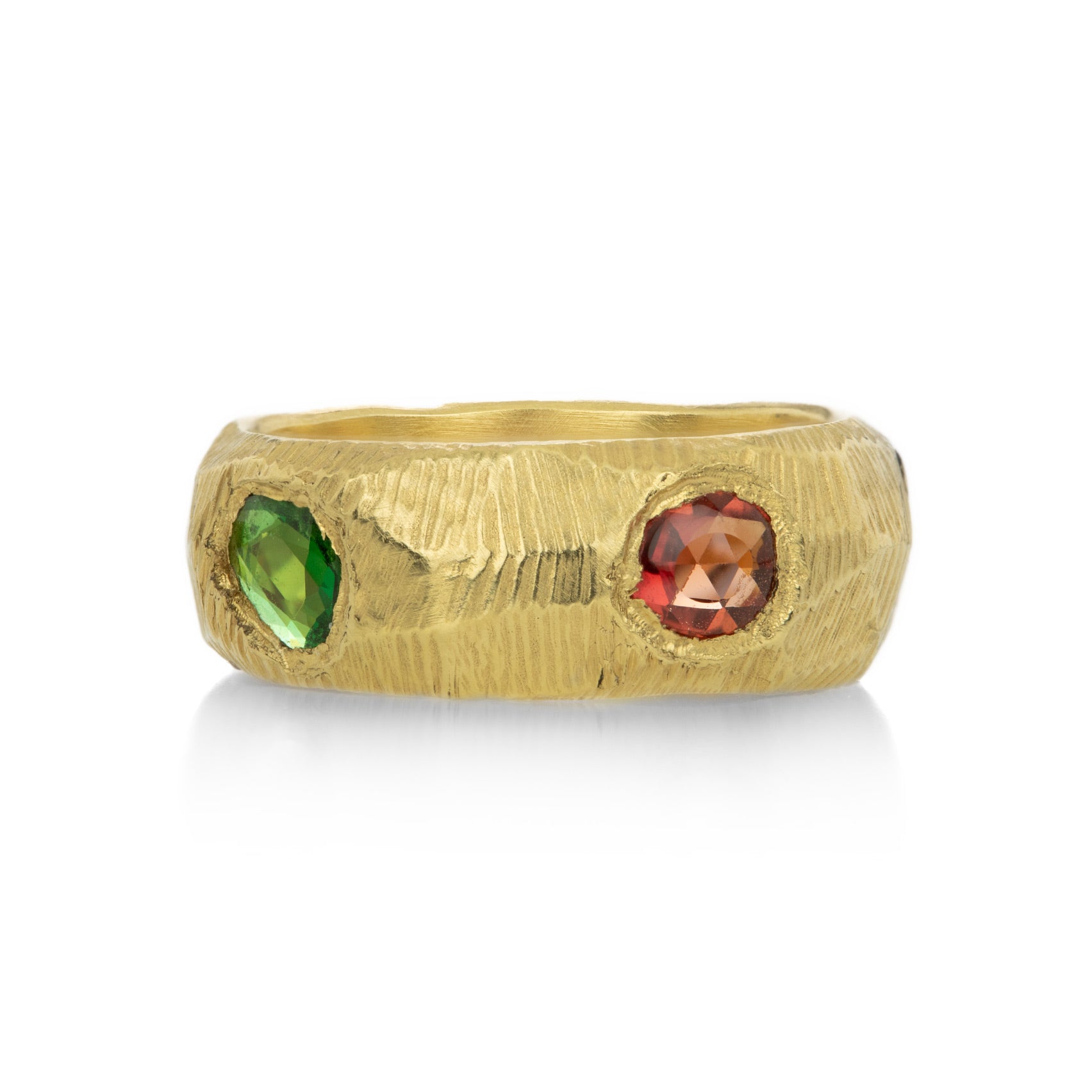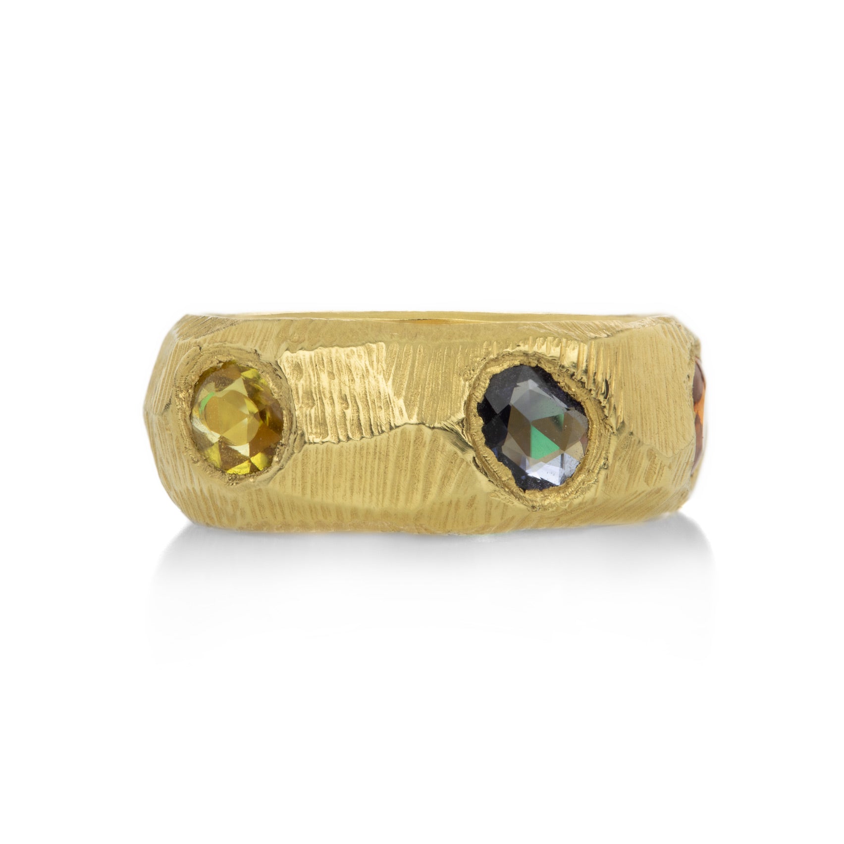 Wear a statement of rugged refinery in this hand carved 18k yellow gold ring from Page Sargisson. The comfortably wide, deliciously textured band features a color burst of four freeform, rose cut multicolored sapphires totaling approximately 1.25 - 1.50cttw. Band width measures approximately 7.5mm. Size 6.5. Handcrafted in Brooklyn, NY, U.S.
