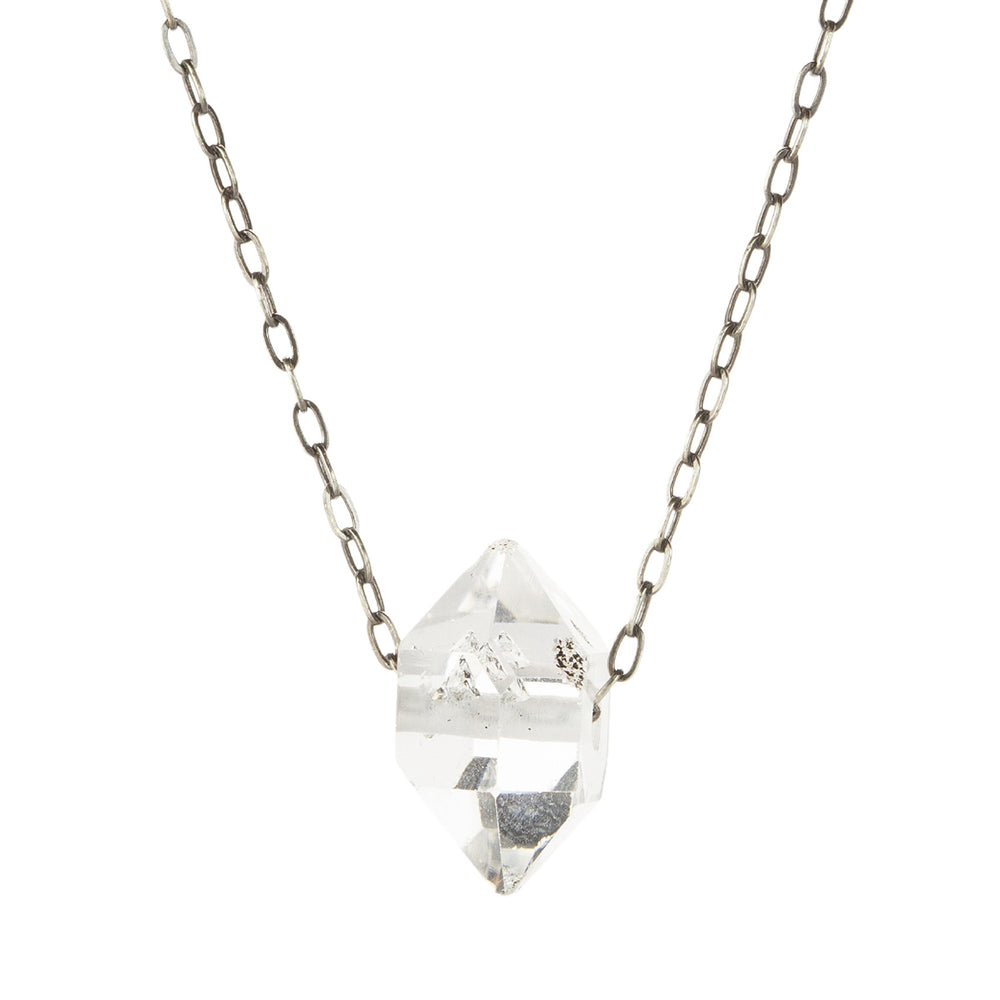 This oxidized sterling silver necklace from Joseph Brooks features a Herkimer diamond quartz crystal, drilled straight through to slide freely on the chain. Herkimer diamond quartz transmits more intensely than typical quartz crystal and is even more powerful. It helps with bravery, honesty, and self doubts, removing fears that hinder spiritual growth. Crystal pendant measures 7/8" x 5/8”. Necklace length measures 22” with a hook and eye clasp. Handcrafted in Los Angeles, CA, U.S.