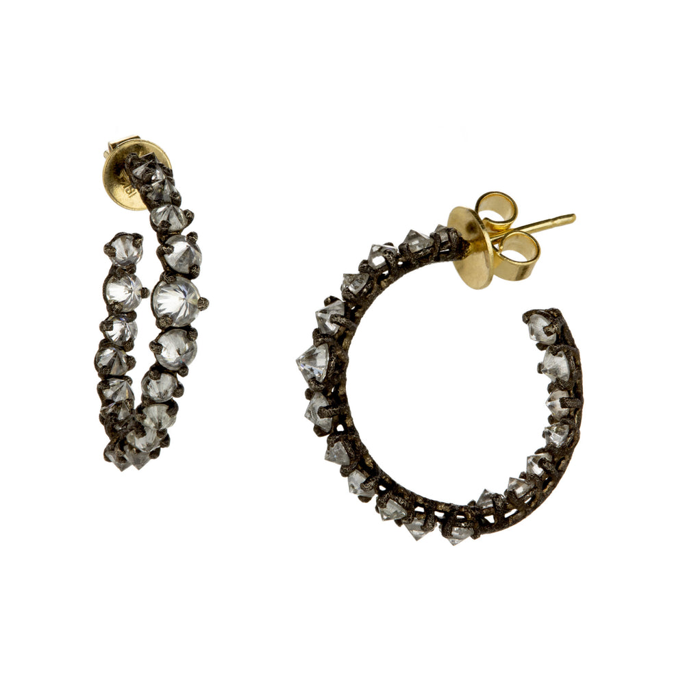 As though they were drawn from a crystal cavern, this magical pair of darkened 14k white gold hoops from Todd Pownell is a treasure to behold! Inverted prong set round diamonds totaling 2.66cttw sparkle from front to back with indescribable mystery. Hoops measure 7/8" in diameter with 18k yellow gold posts and backs. Handcrafted in Cleveland, OH, U.S.