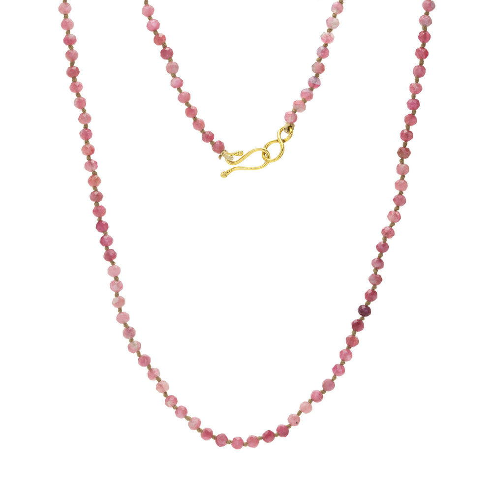 Infuse a longer layer of luscious gemstone sparkle to your look in this simply elegant beaded necklace from Lena Skadegard. Faceted pink tourmaline beads find the light in a hand knotted arrangement with lovely drape. Total length with a 9k yellow gold hook clasp measures 25". Handcrafted in India.
