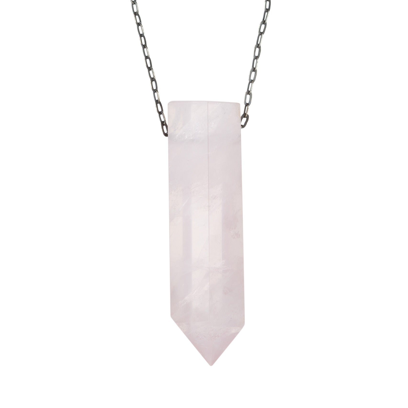 This oxidized sterling silver necklace from Joseph Brooks features a rose quartz crystal, drilled straight through to slide freely on the chain. Rose quartz is connected to the heart chakra. It helps us trust ourselves and cultivate compassion for ourselves and others, so that we can love and find true joy in life. Pendant measures 2 3/8" x 3/4". Chain length measures 22” with a hook and eye clasp. Handcrafted in Los Angeles, CA, U.S.