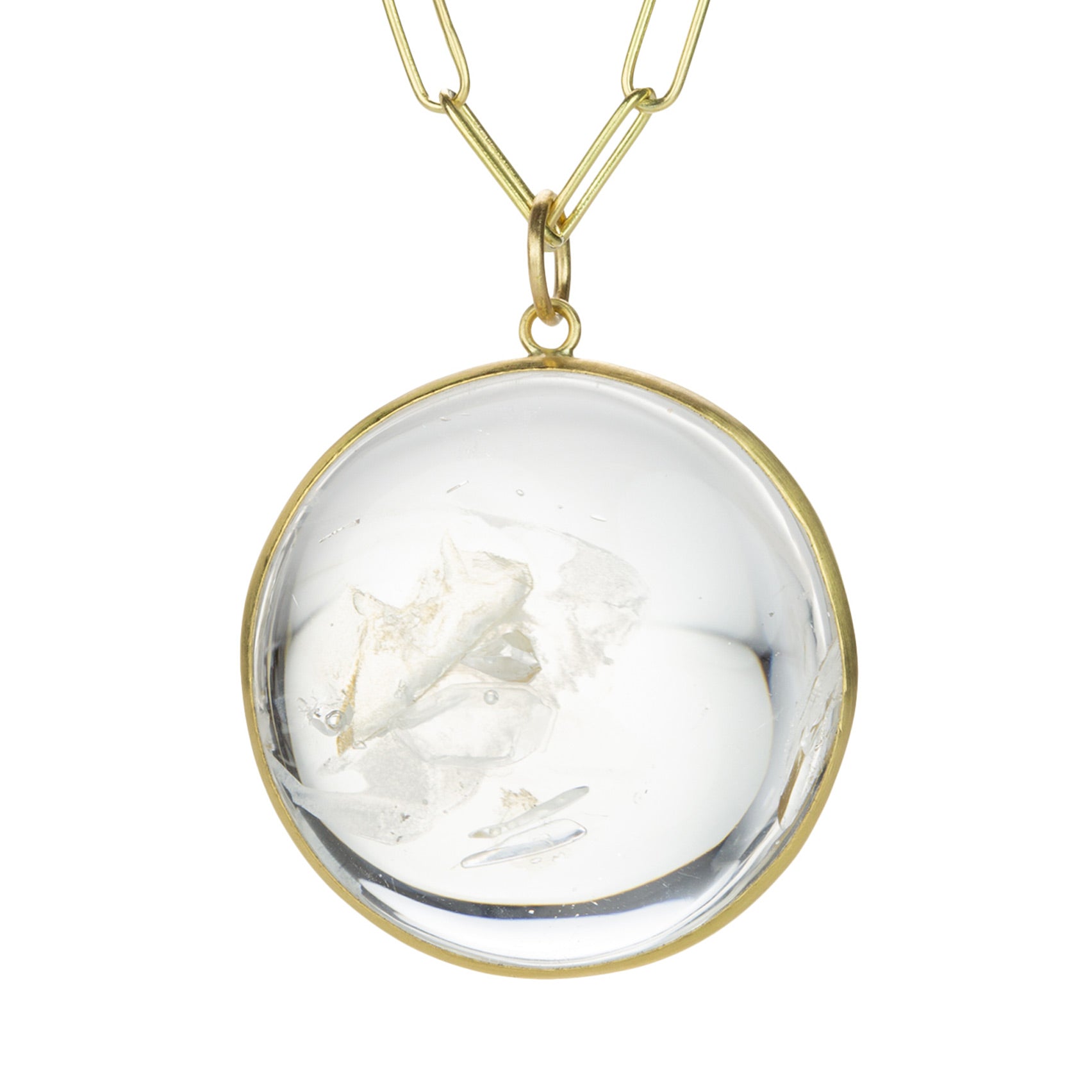 Feel the ancient energy in this enhydro quartz pendant from Maria Beaulieu, set in an 18k yellow gold bezel. The trapped water bubble has been settled within the quartz for millennia or more! Wear it on one of the artist's handmade gold link chains for a look of subtle sophistication. Pendant length measures 1 3/4" including bail. Chain is sold separately. Handcrafted in Brooklyn, NY, U.S.