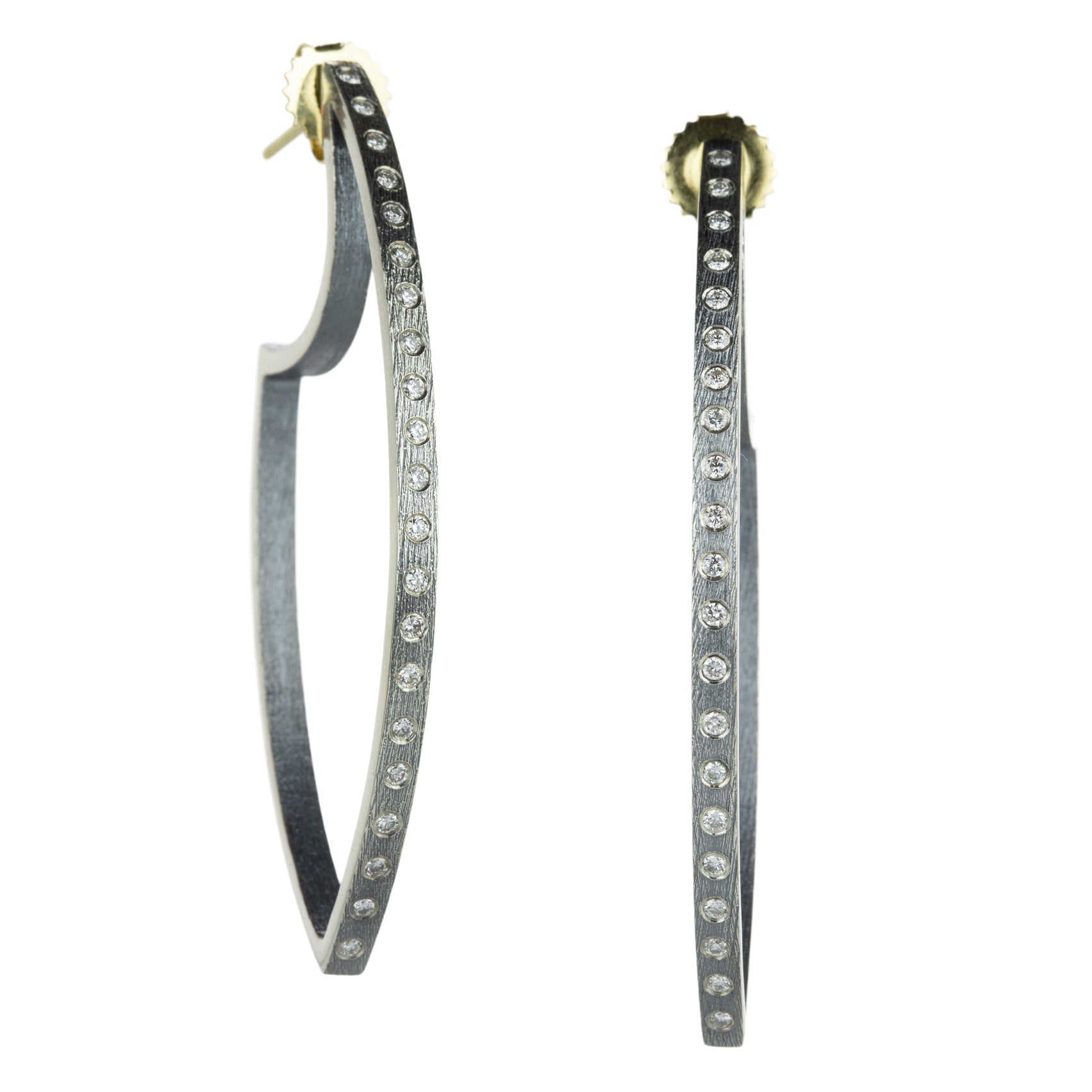Rock to the beat of your own drum in this edgy pair of sterling silver hoops from Rene Escobar. Large open marquise shapes with a clever back cutout are studded with surface set white diamonds totaling 0.45cttw. The hoops drip sparkle and glam! Total length measures 2 1/8” with 18k yellow gold posts and backs. Handcrafted in Miami, FL, U.S.