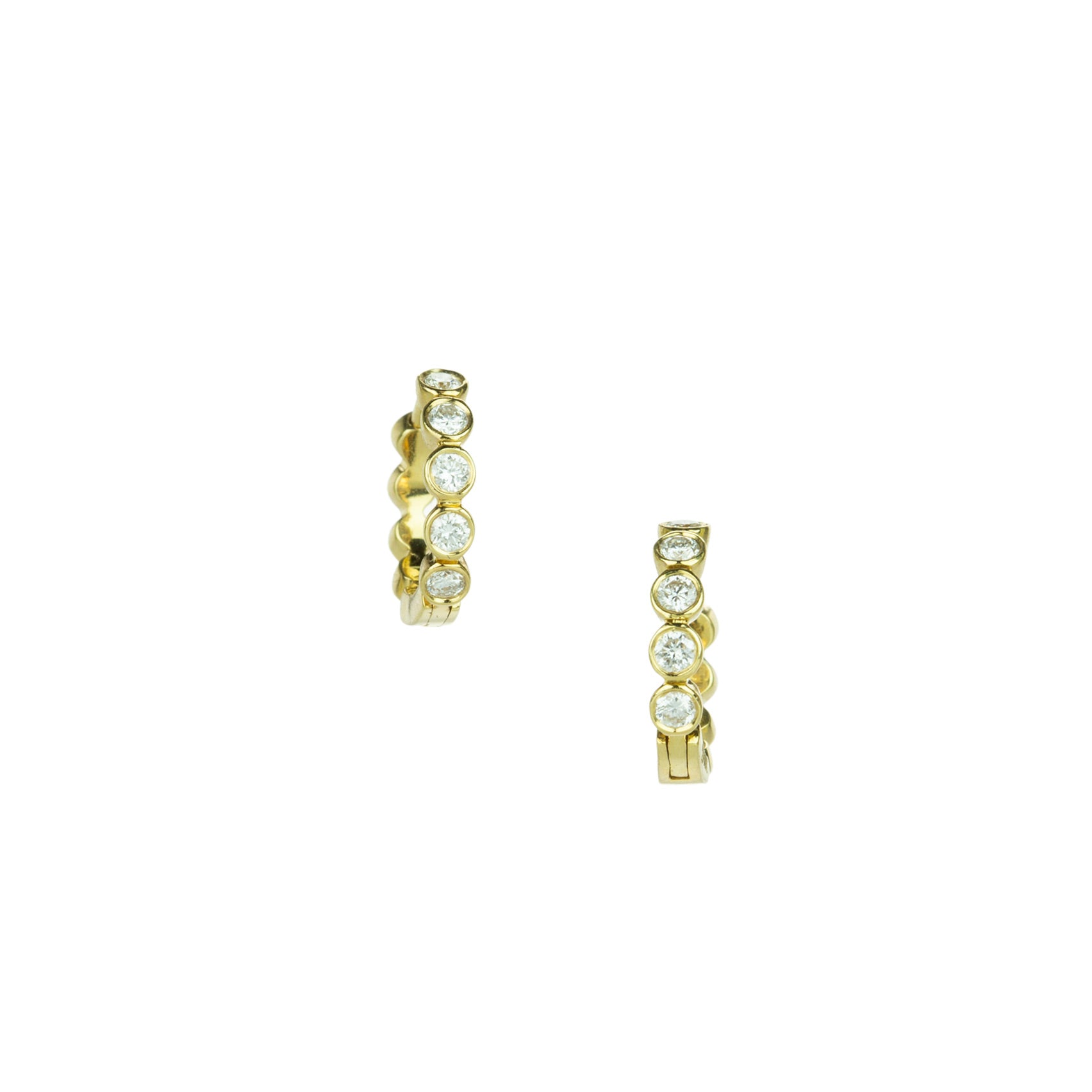This pair of 18k yellow gold huggie hoops from Sethi Couture covers all the bases with twinkling round white diamonds totaling 0.25cttw, facing front and back in smooth polished bezels. So perfect you'll never take them off, the hoops measure 3/8” in diameter. Handcrafted in Indore, India.