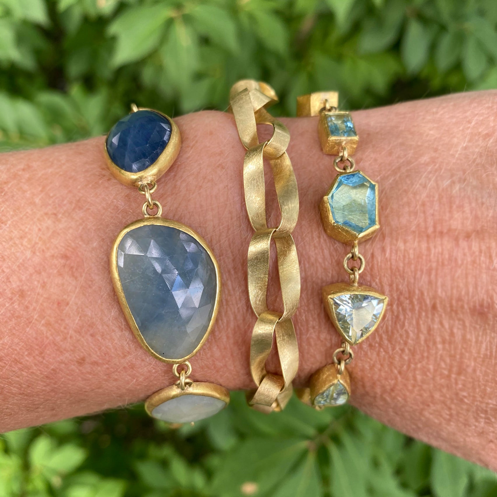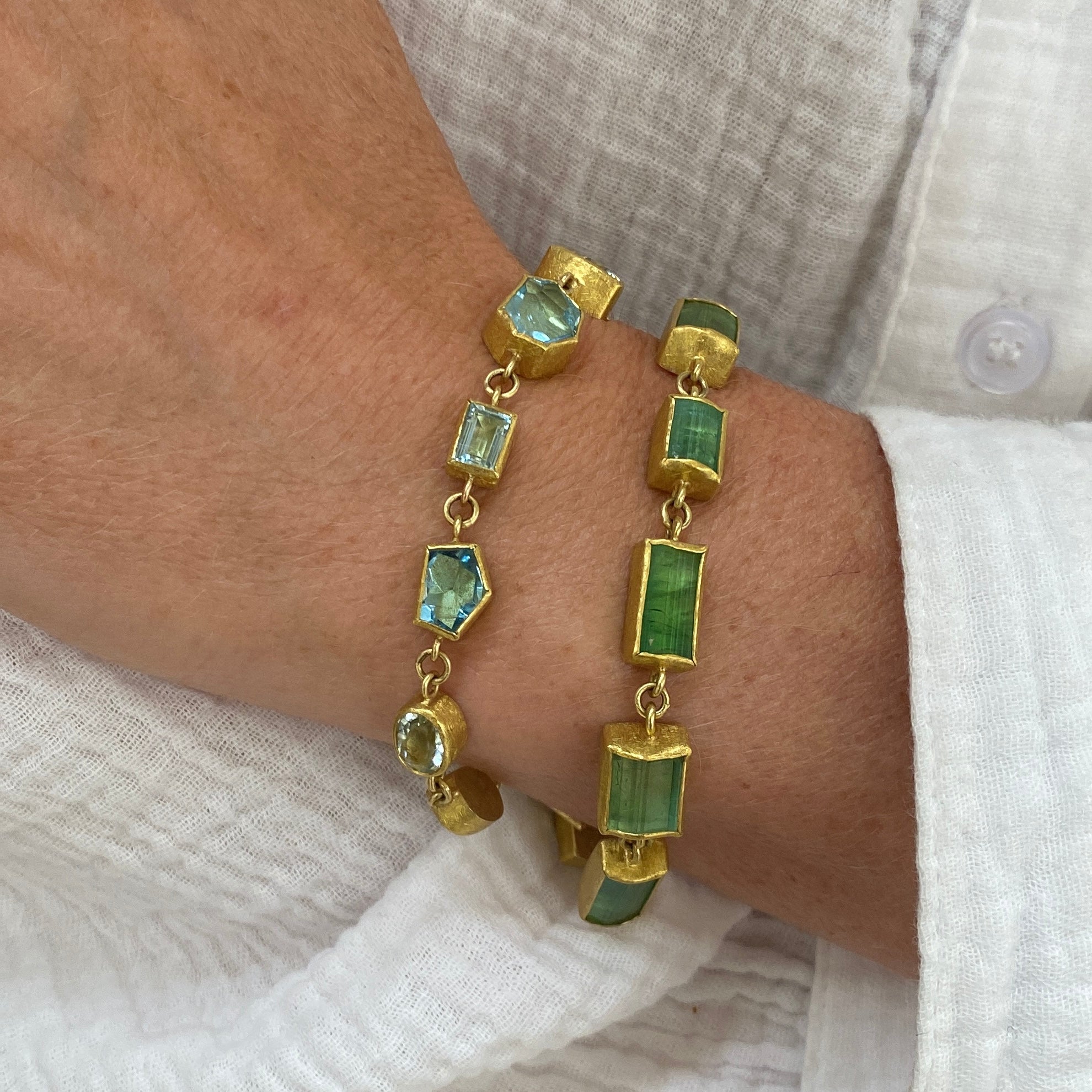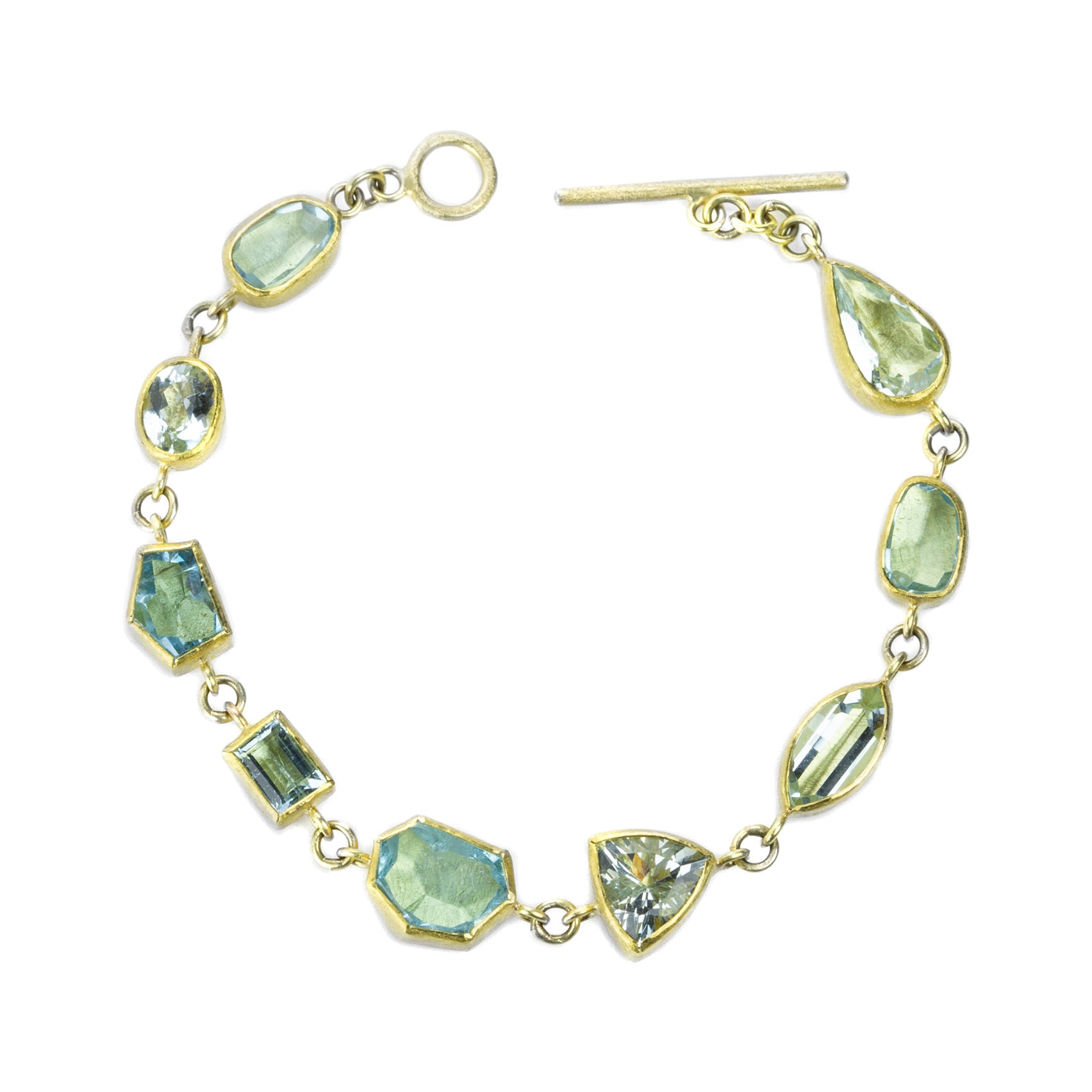 An eclectic collection of the treasured gem named for the sea, this 18k and 22k yellow gold bracelet from Petra Class features mixed shape and cut aquamarines. Each stone as unique as the next, the gems are bezel set and connected with heavy links. Total length with toggle clasp measures 7". Handcrafted in San Francisco, CA, U.S.