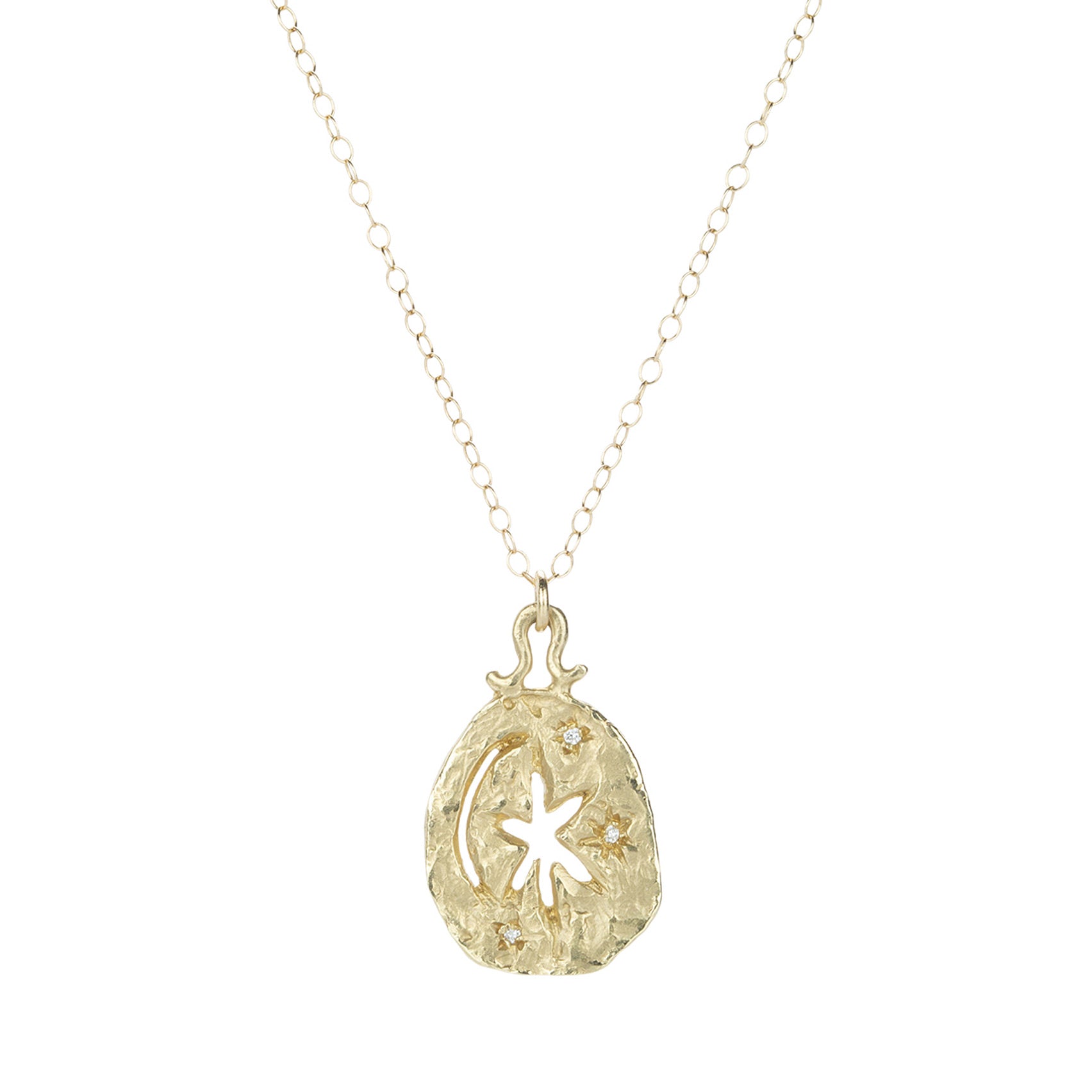 Follow your own heart home in this 14k yellow necklace from Victoria Cunningham, featuring a richly textured pendant with a negative space moon and north star. Three tiny diamonds light the way. Pendant measures 1/2" x 3/4”. Lightweight chain with spring ring clasp measures 18". Handcrafted in Los Angeles, CA, U.S.