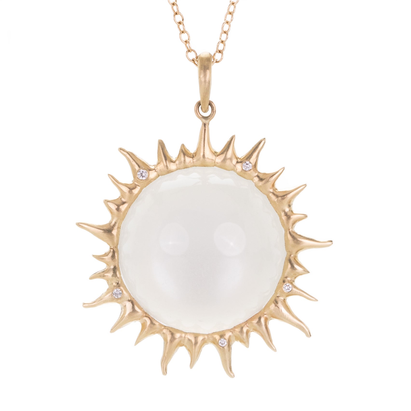 One of the galaxy’s greatest wonders is celebrated in this celestial 14k yellow gold necklace from Annette Ferdinandsen. A white moonstone eclipses a golden sun with radiant diamond fire. Pendant measures 1 1/4”. Chain length with lobster clasp measures 18". Handcrafted in Hudson Valley, NY, U.S.