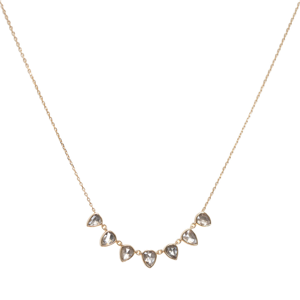 A 14k yellow gold chain with seven rose cut gray diamond teardrops. Necklace can be worn at 15", 16" or 17". Handcrafted in Belgium.