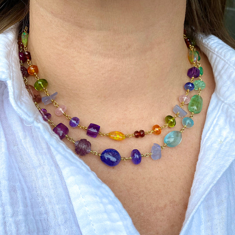 Wear the magic of the rainbow! This absolutely luscious 18k and 22k yellow gold spun sugar necklace from Mallary Marks covers all the bases with a fun, versatile, luxurious style. Opal, amethyst, tanzanite, morganite, chalcedony, peridot, mandarin garnet and hessonite garnet beads are carefully arranged and hand wrapped for a lovely drape. Total length measures 17". Handcrafted in New York, NY, U.S.
