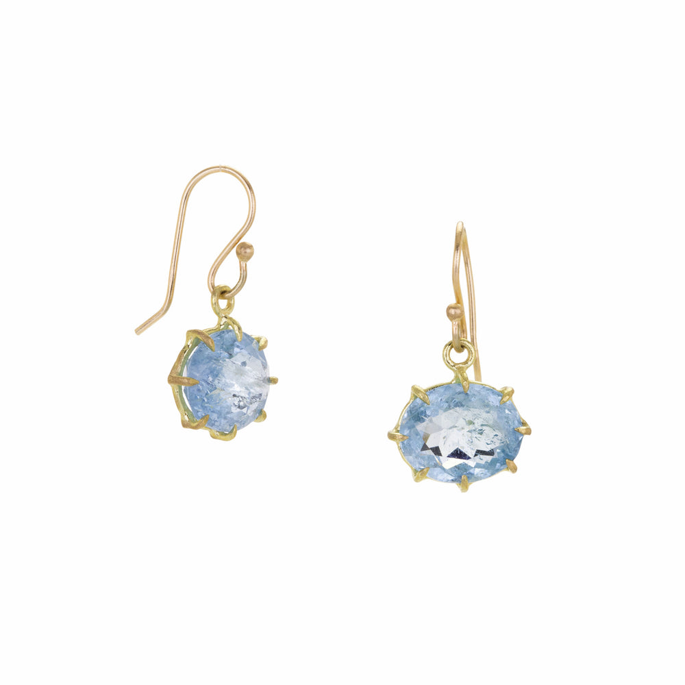 Like a cool drink of water, this pair of 18k yellow gold earrings from Rosanne Pugliese will refresh any look from formal to fun! Featuring oval faceted aquamarine drops set in minimalist prongs, these beauties quench your thirst. Total length measures 7/8” with curved 14k yellow gold ear wires. Handcrafted in Brooklyn, NY, U.S.