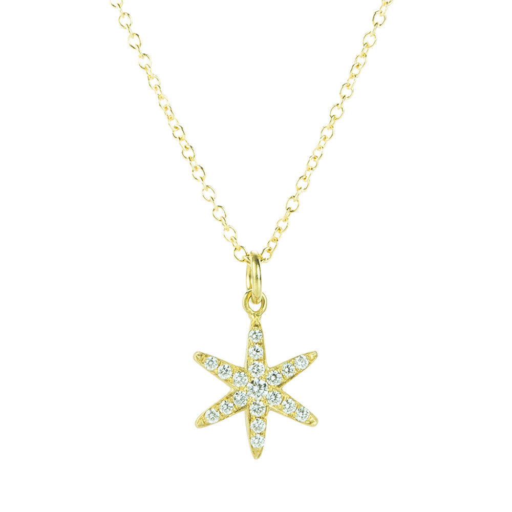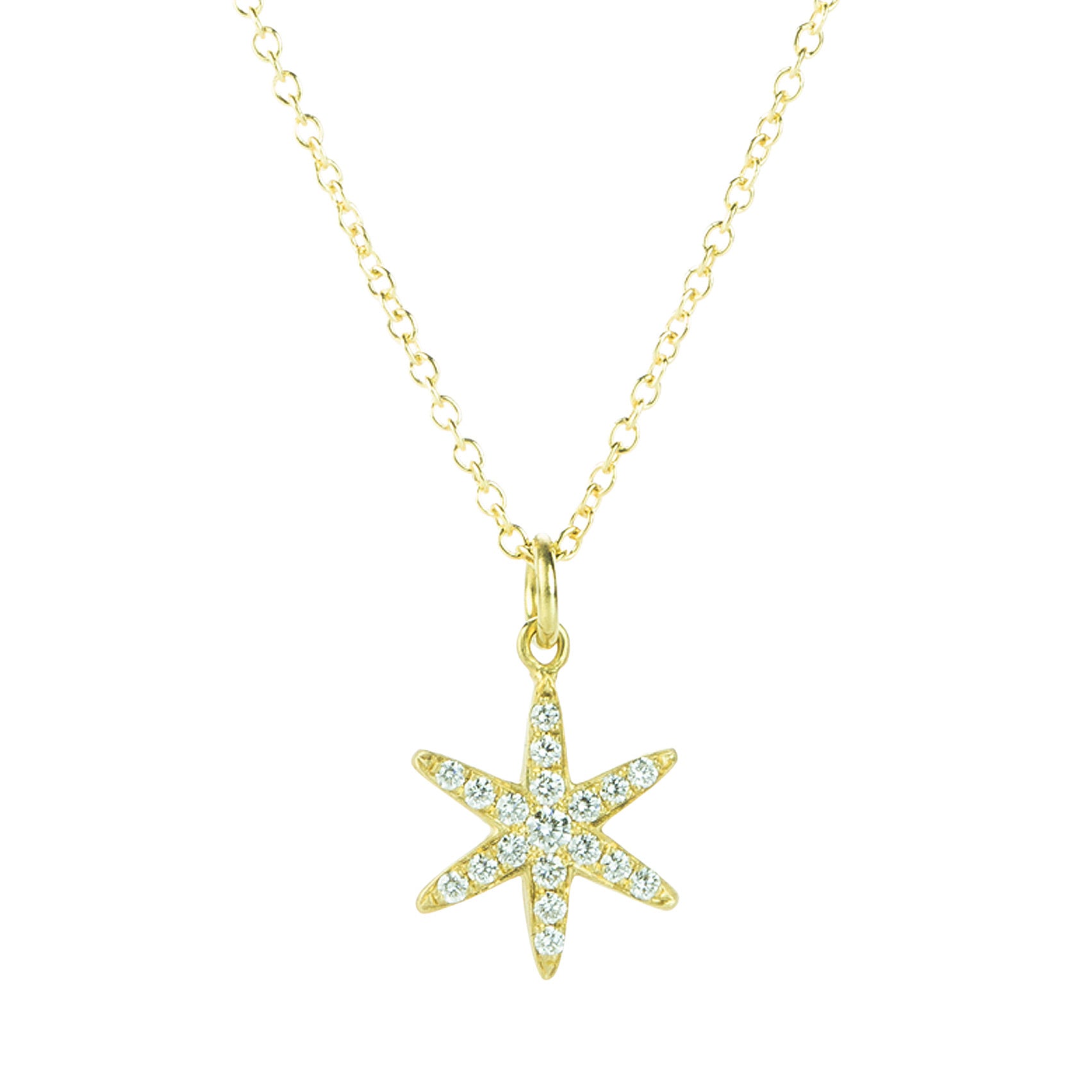 Match your jewelry with the twinkle in your eyes in this 18k yellow gold necklace from Anne Sportun. A six pointed star pendant features a sparkling array of pavé white diamonds totaling 0.097cttw. Pendant measures 1/2" in length, including bail. Fine chain necklace can be worn at 16" or 18" with a spring ring clasp. Handcrafted in Toronto, ON, Canada.
