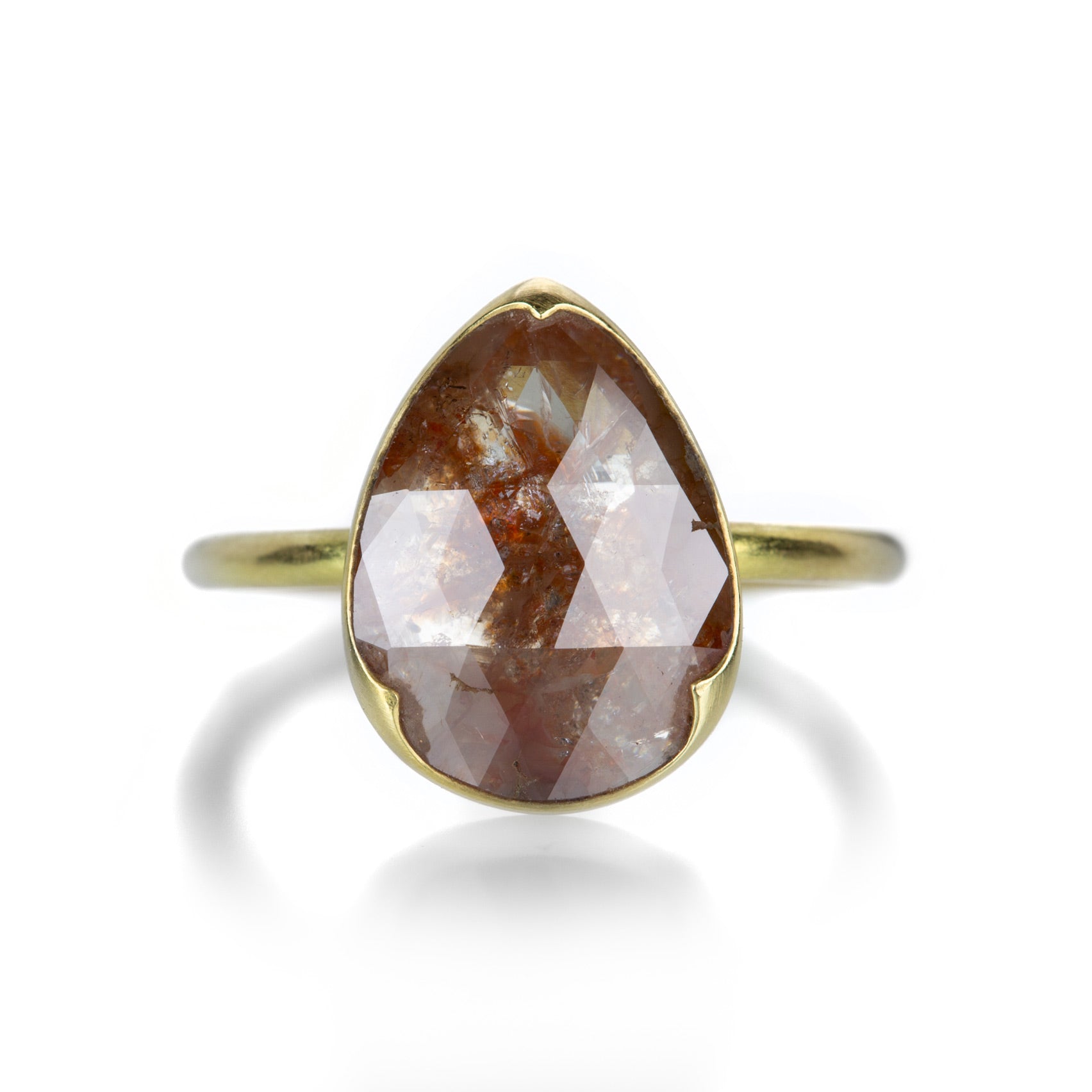 A natural beauty, this Gabriella Kiss ring boasts a unique shape and radiates sparkle! The teardrop shaped 4.91ct orange lacy diamond is held delicately in a triple scalloped bezel, and sits on a rounded band. We think this ring would be a lovely engagement ring for a non-traditional bride! Stone measures about 5/8” x 1/2" including the bezel. Size 6.5. Handcrafted in Hudson Valley, NY, U.S.