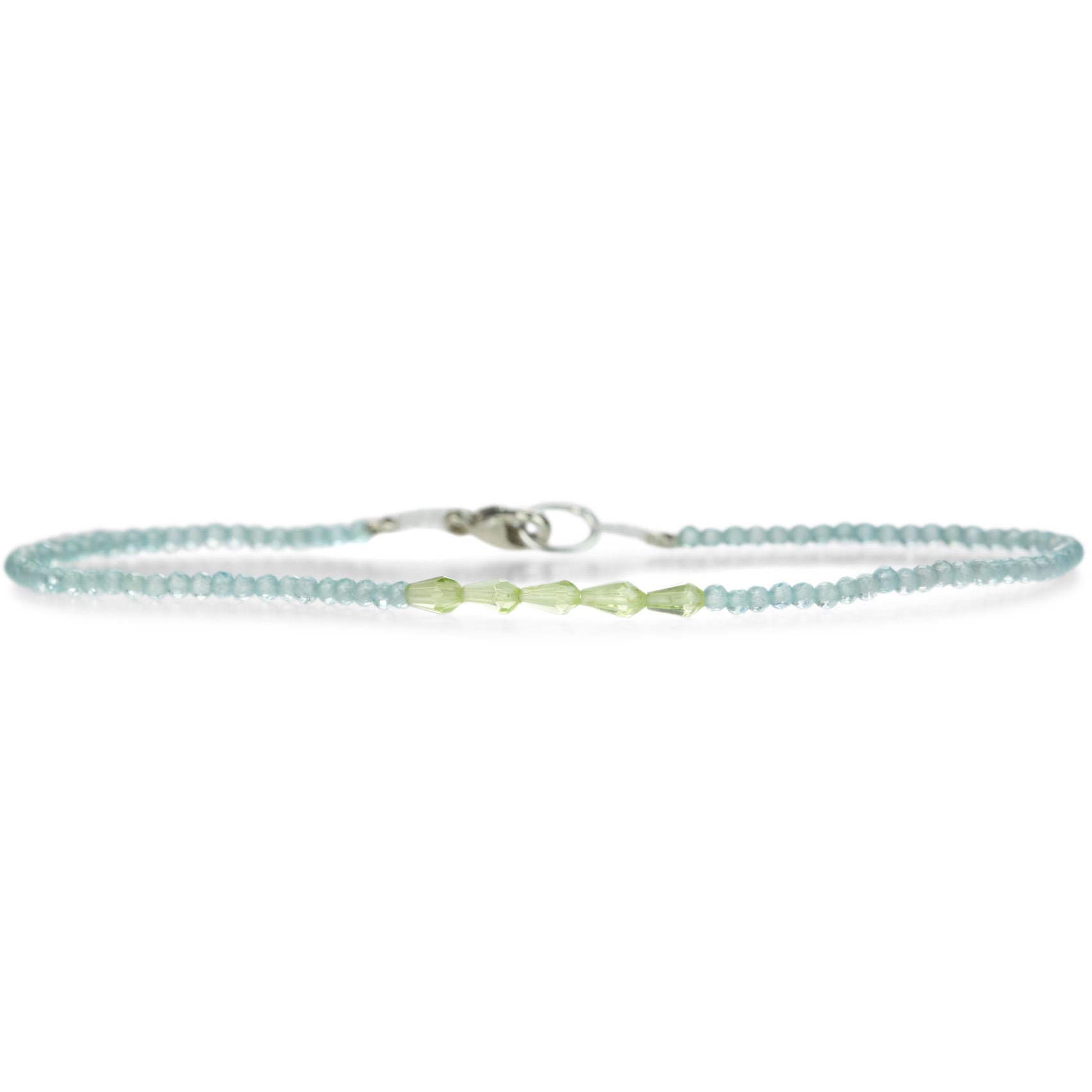 Perfect for layering, this faceted apatite beaded bracelet from Margaret Solow would also make a delicate accent piece all on its own. With a row of peridot accent beads and a sterling silver lobster clasp, the total length measures 7". Handcrafted in Los Angeles, CA, U.S.