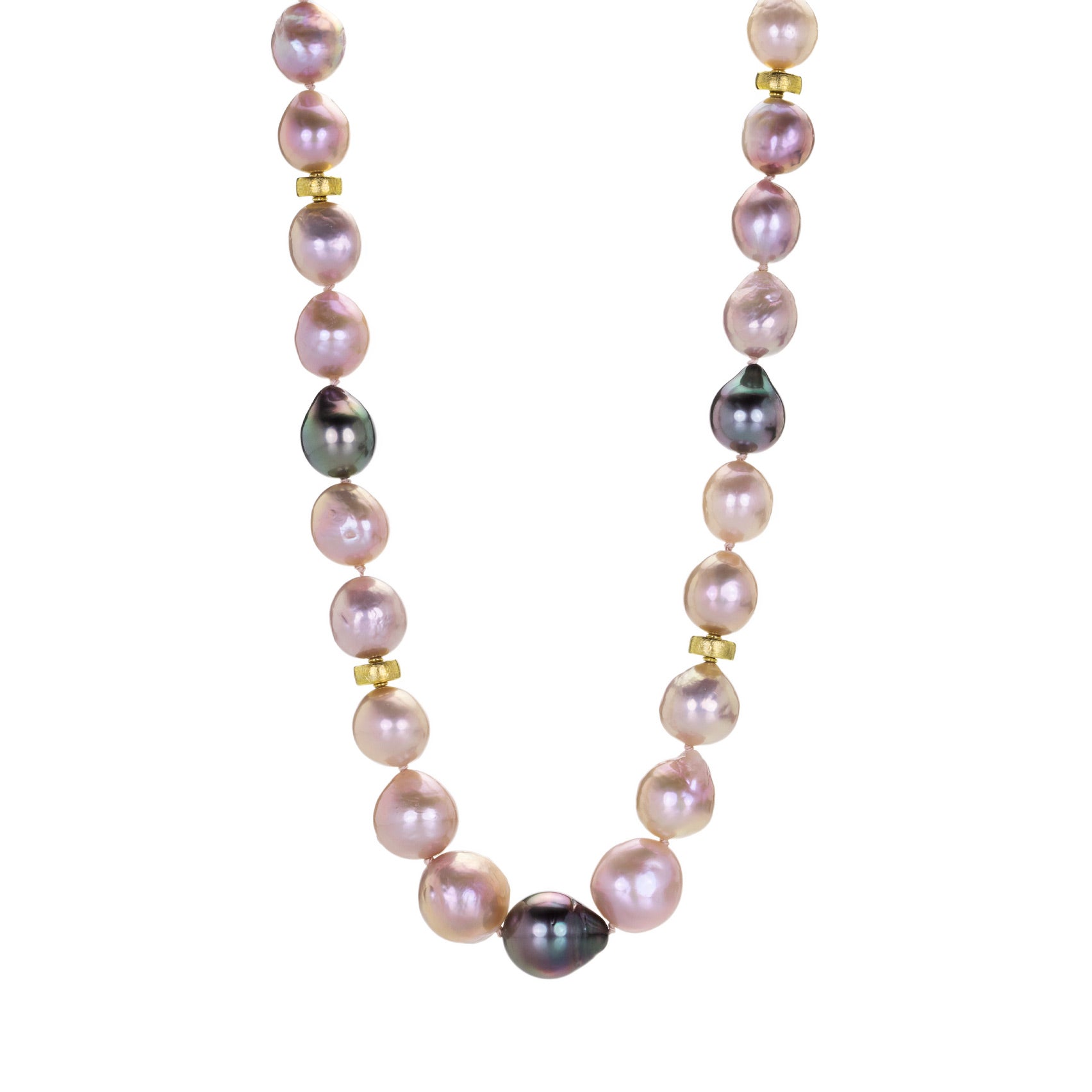 Soft and serene with a hint of drama, this 18k yellow gold necklace from Barbara Heinrich features 9mm-13mm pink Chinese freshwater pearls and five, 10mm-13mm black Tahitian pearls, hand knotted on silk. 18k yellow gold spacers and a toggle clasp add a dash of golden glow. Total length measures 18". Handcrafted in Rochester, NY, U.S.