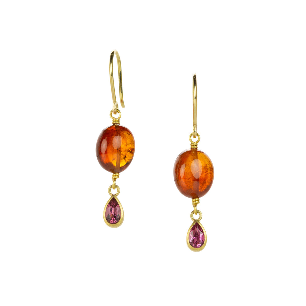 Jump into a brand new you in bright, festive colors and fresh, fun gemstone combos from Mallary Marks! This pair of 22k and 18k yellow gold earrings features oval, cabochon spessartite garnet bead drops paired with teardrop shaped, bezel set pink tourmaline drops. Total length with curved ear wires measures 1 1/4". Handcrafted in New York, NY, U.S.