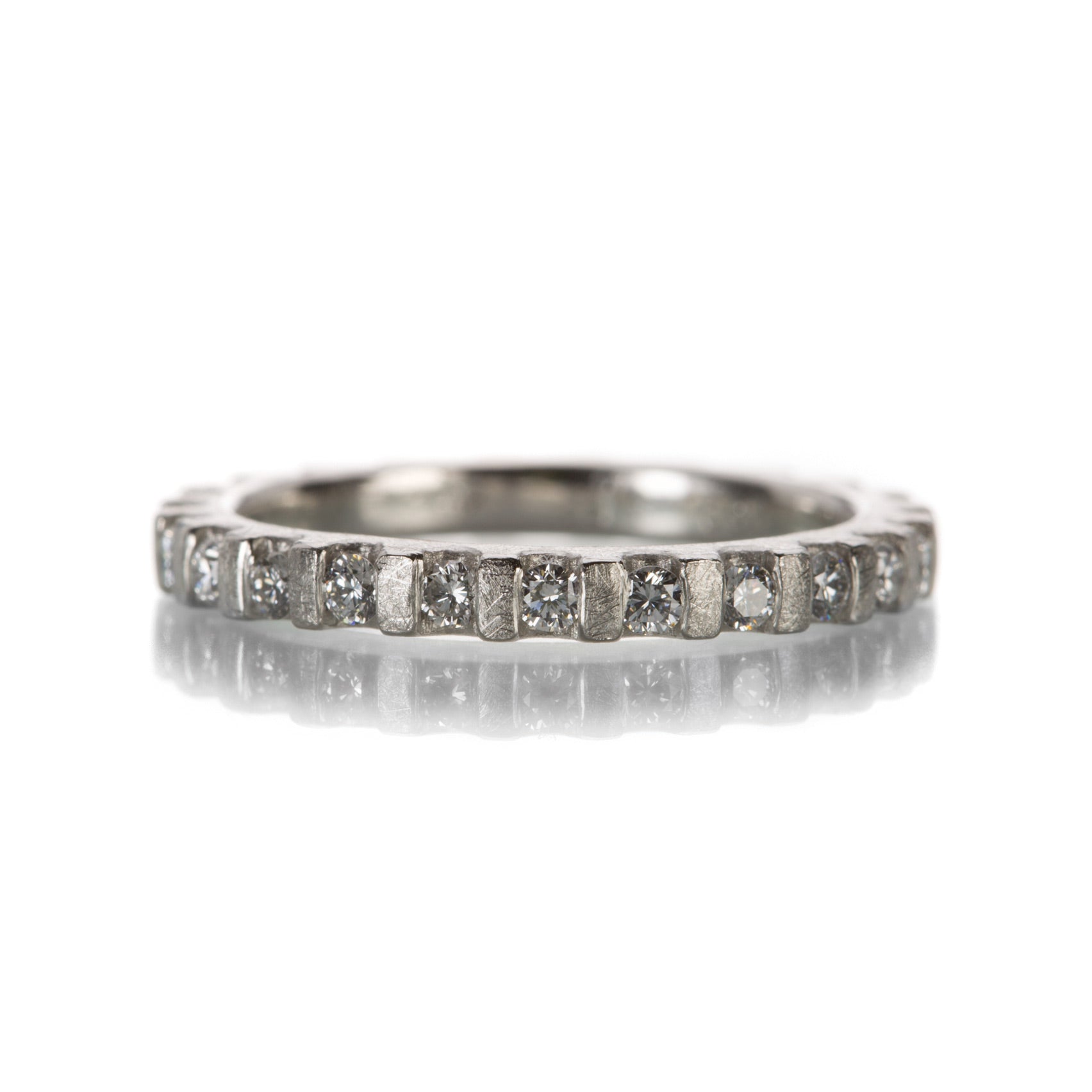 The quintessential stacking ring, an eternity band is a must have staple in every jewelry box. This platinum ring from Barbara Heinrich features white diamonds totaling 0.72cttw. The gear-like form adds a fine mechanical feel to the design. Size 6.5. Handcrafted in Rochester, NY, U.S.