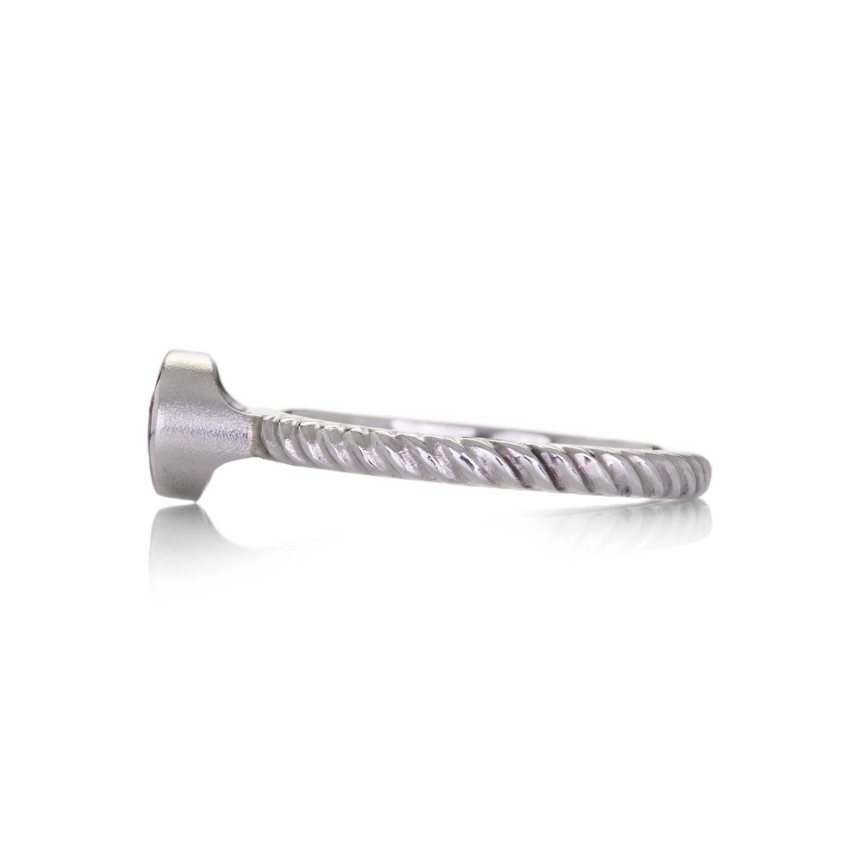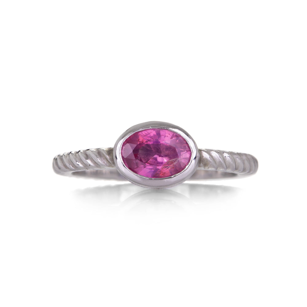 Stand out from the crowd in this brilliantly bright platinum ring from Barbara Heinrich! An oval, 1.04ct pink sapphire is set in a high polish bezel on a twisted rope band. This piece is perfect for stacking with two or three diamond bands, or wear it alone as a tribute to your favorite color! Size 5.5. Handcrafted in Rochester, NY, U.S.