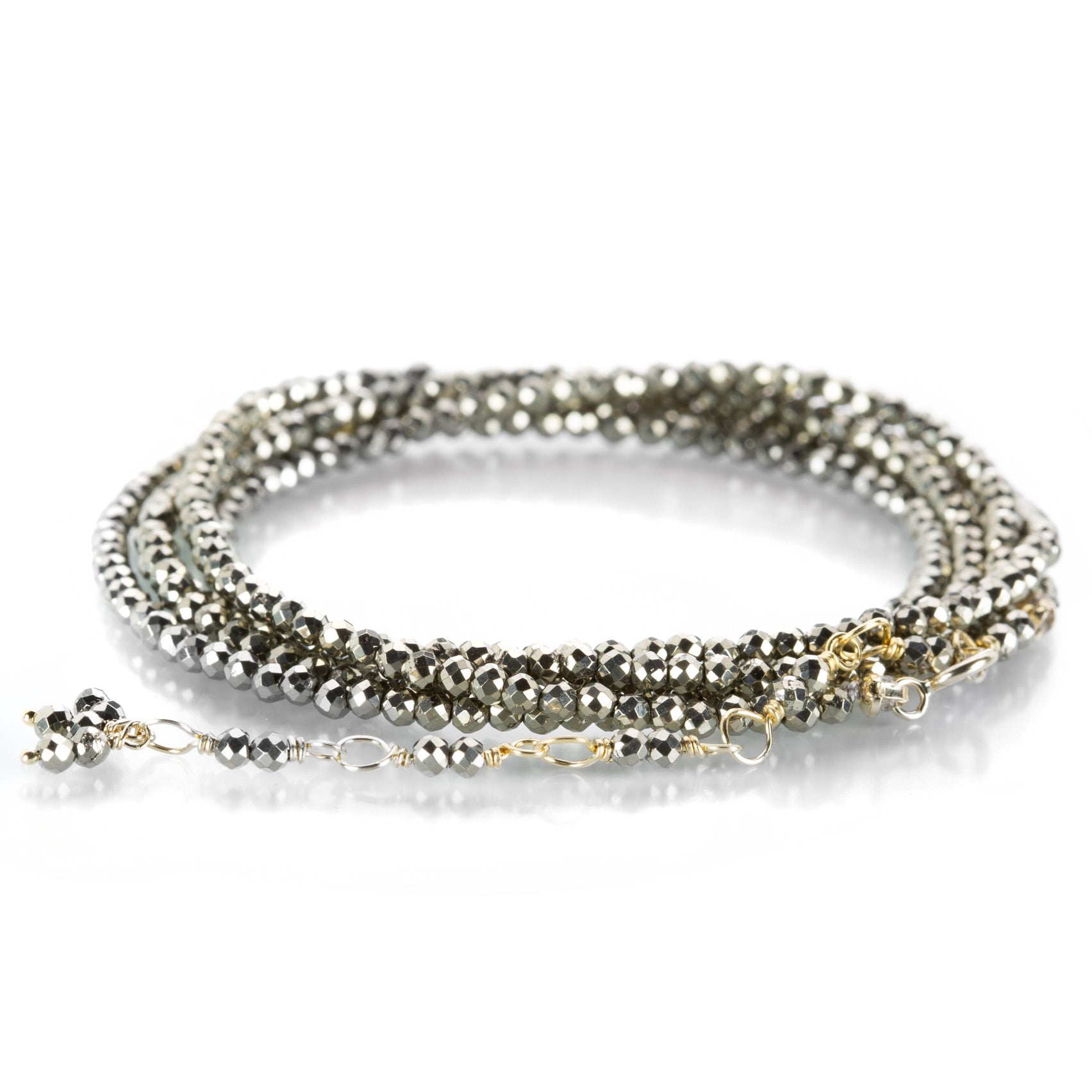 Proclaim your original sense of style with an Anne Sportun wrap bracelet! Brilliantly accented with a 14k gold hex bead, this faceted pyrite bracelet adds five rows of neutral sparkle to your wrist stack. A truly versatile piece, it can also be worn as a long necklace or wrapped around twice for a shorter, layered look. Bracelet measures up to 34" with a 14k yellow gold wire wrapped 2" extension and spring ring clasp. Handcrafted in Toronto, ON, Canada.
