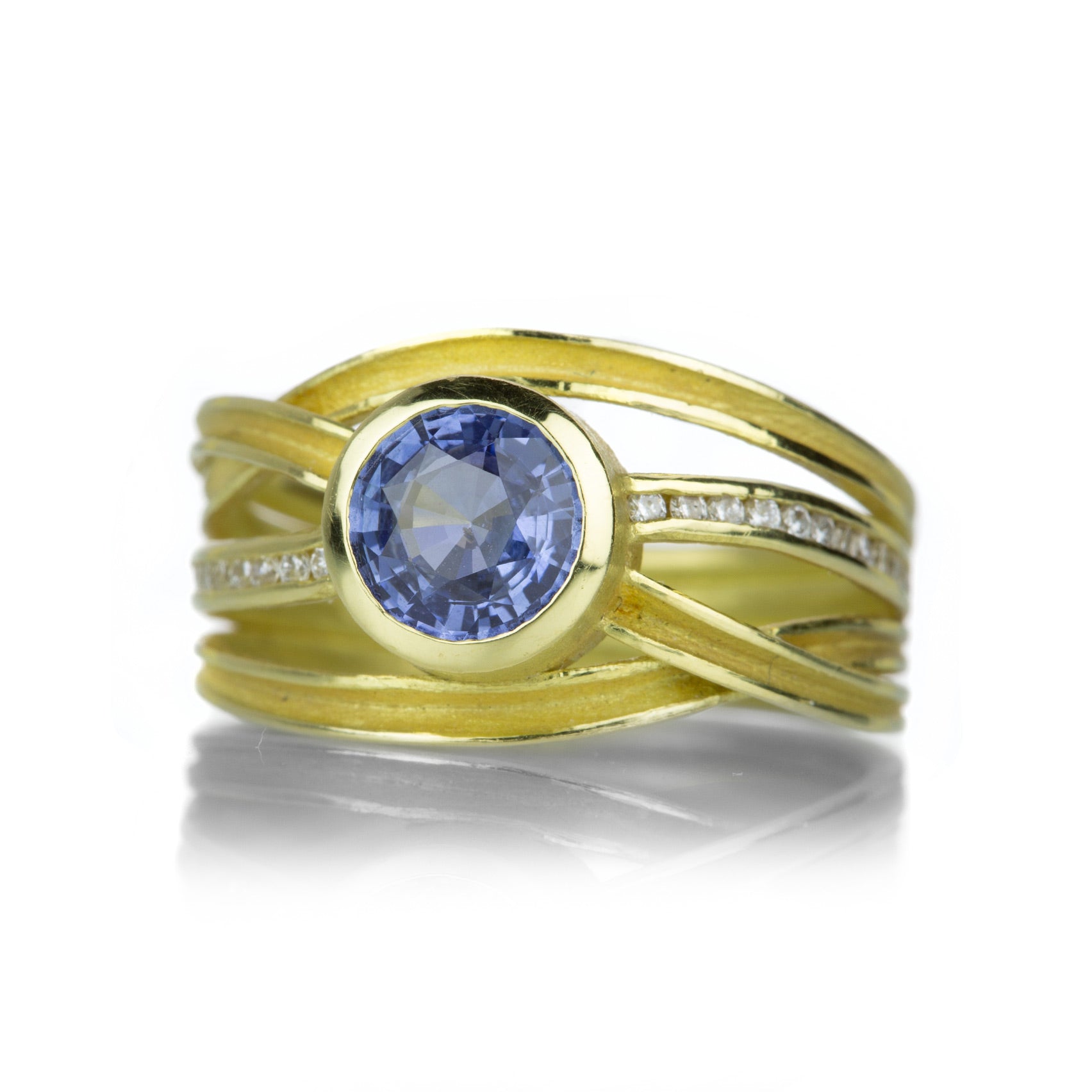 Ribbons of gold embrace a pool of sparkling blue in this 18k yellow gold ring from Barbara Heinrich. The 1.29ct faceted cornflower blue sapphire is bright and beautiful, surrounded by a row of channel set white diamonds totaling 0.16cttw, imparting a calming sense on the wearer. This piece would make a lovely gift for a September born loved one. Size 7.5. Handcrafted in Rochester, NY, U.S.