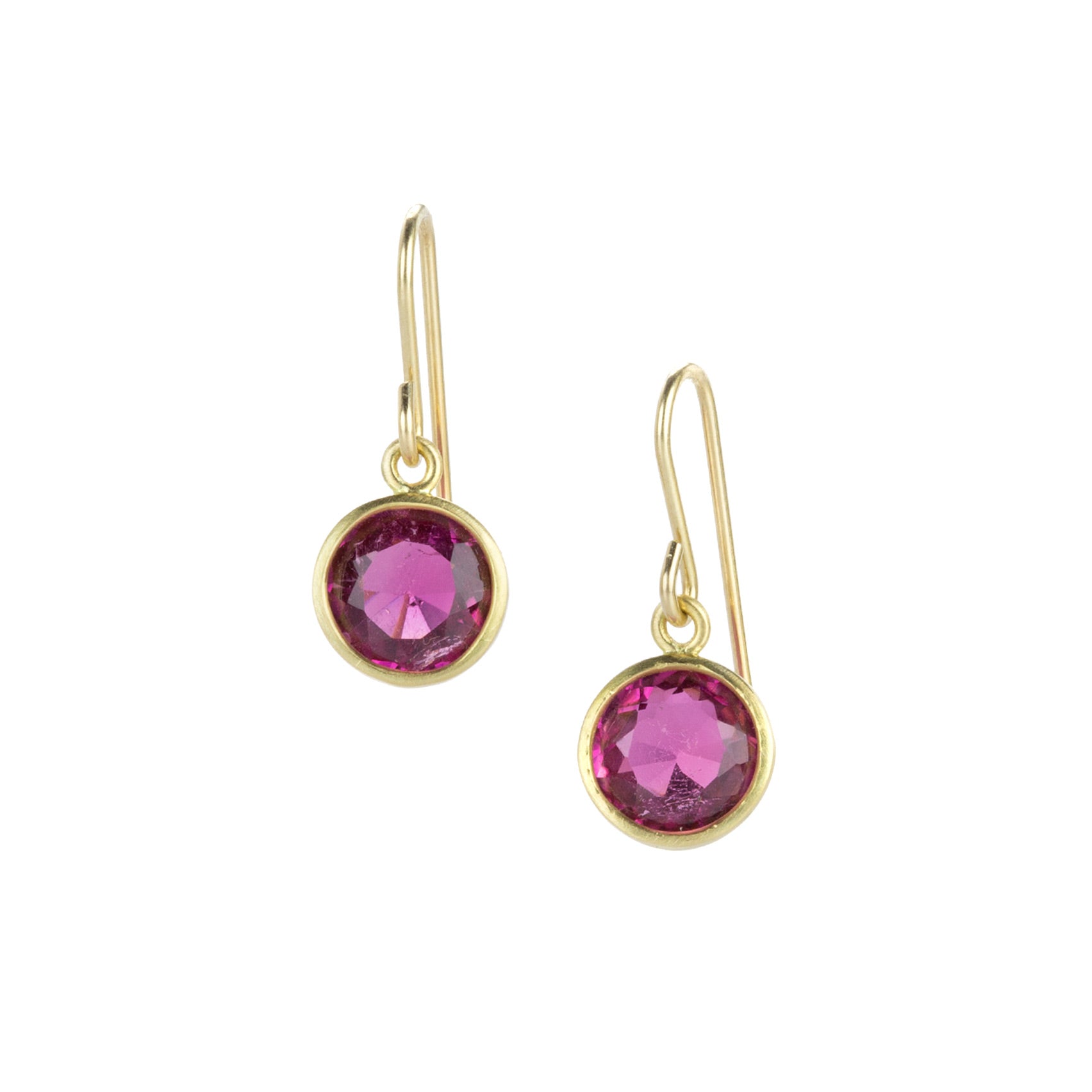 Let life’s little luxuries delight you! This pair of 18k yellow gold earrings from Maria Beaulieu features faceted round pink tourmaline drops, minimally bezel set to let the juicy color of the gemstones shine. Stones measure 8.5mm. Total length measures 7/8” on curved ear wires. Handcrafted in Brooklyn, NY, U.S.