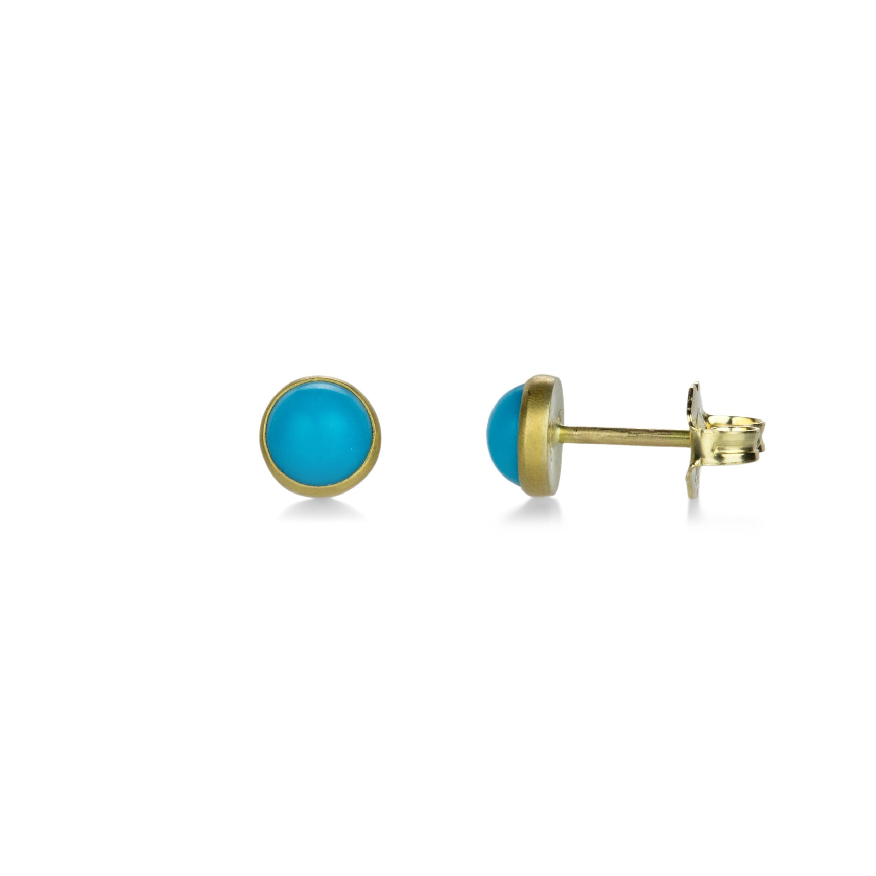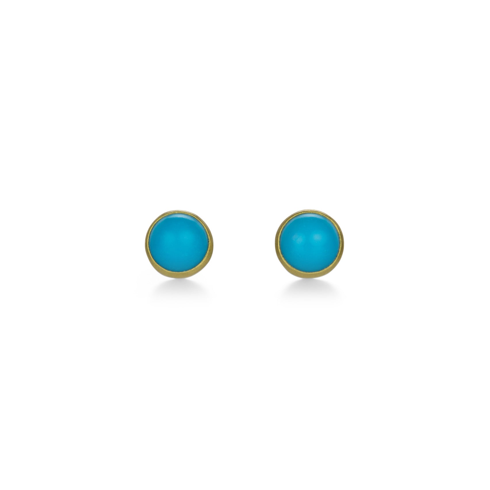 Let bright, fresh color be your new staple accessory in this pair of 18k yellow gold gemstone studs from Lola Brooks. Round Sleeping Beauty turquoise cabochons totaling 1.15cttw shine in their minimalist brushed bezel settings. Studs measure approximately 1/4" in diameter. Handcrafted in Lexington, GA, U.S.