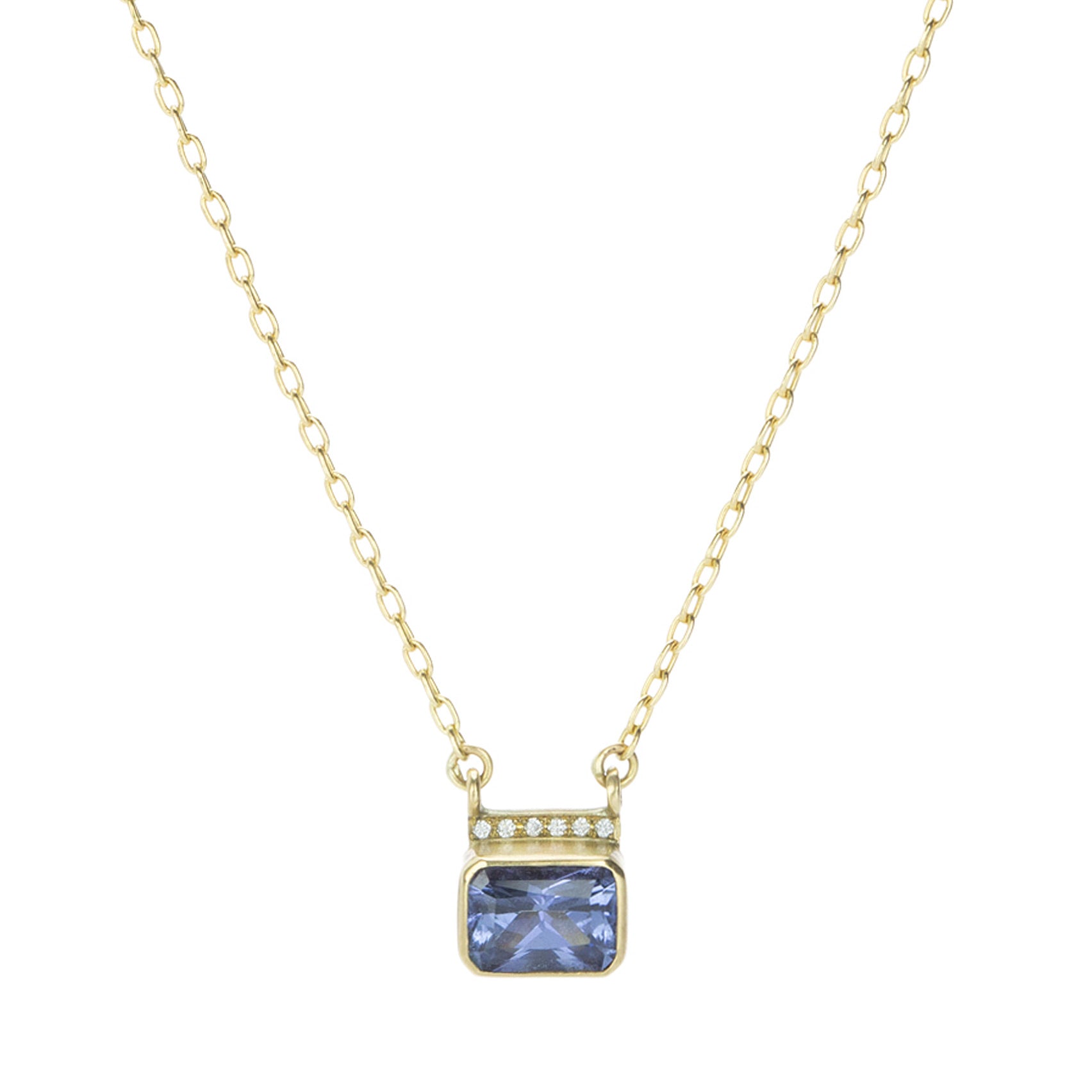 Lavish yourself in the blissful blue of this 18k yellow gold necklace from Annette Ferdinandsen, featuring an emerald cut blue sapphire pendant. The stunning stone is set east-west in a bezel with diamond pavé along the top. Pendant measures 1/4" in width. Chain length measures 18”. Handcrafted in Hudson Valley, NY, U.S.