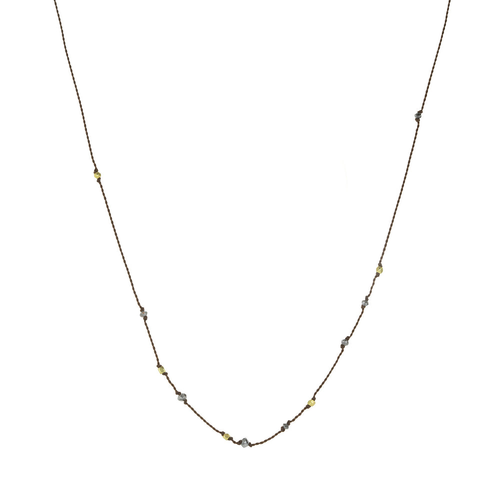 This delicate and versatile brown nylon cord necklace from Margaret Solow features faceted gray diamond beads accented with faceted 18k yellow gold accent beads. Layer it into your neck party and let the sparkling fun begin! Total length with 14k gold lobster clasp measures 15 1/2“. Handcrafted in Los Angeles, CA, U.S.