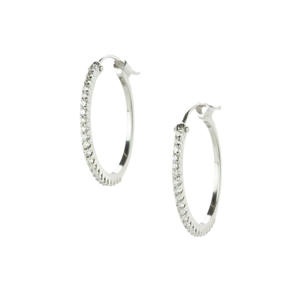 Sethi Couture has your hoop needs covered! This perfect pair of 18k white gold small hoop earrings sparkles with diamonds totaling 0.35cttw. These will take you from lunch dates to late night escapades without dimming the dazzle. Hoops measure 5/8" in diameter. Handcrafted in Indore, India.
