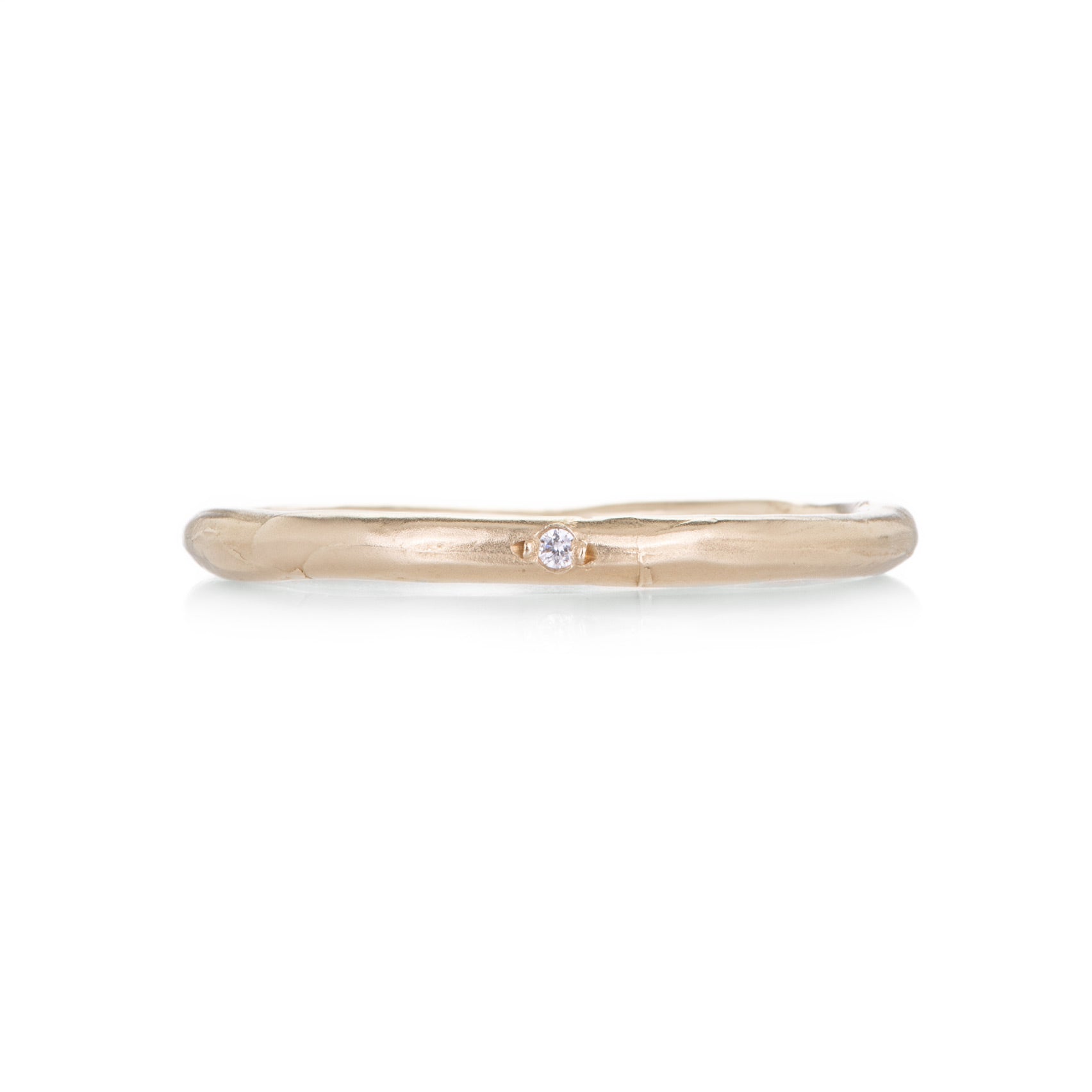 Stack up the delicate love in this 14k yellow gold band from Victoria Cunningham. The satin finish and organic form sparkles with a single bead set white diamond. Size 6.25. Handcrafted in Los Angeles, CA, U.S.