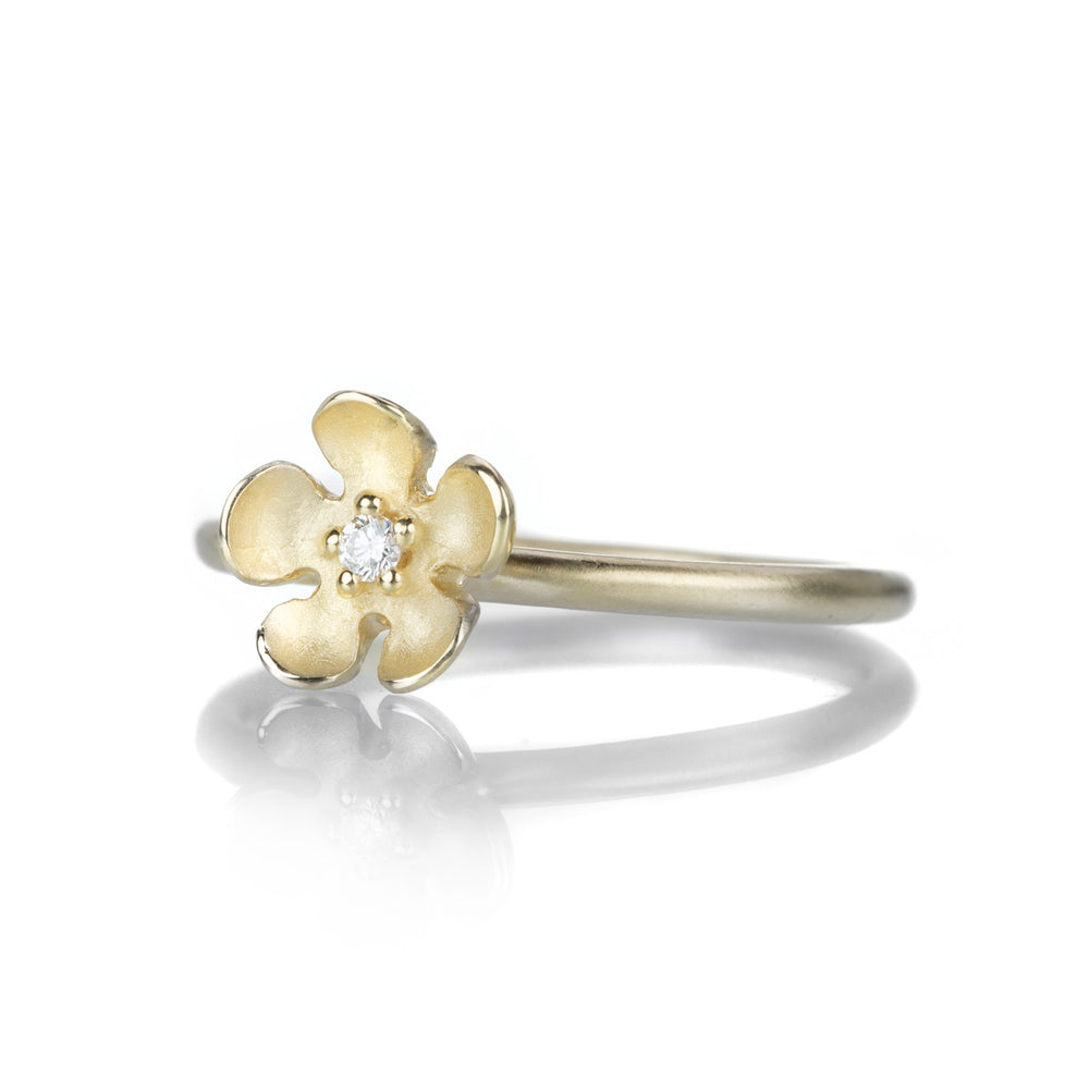 With a hint of dewy sparkle, this 14k yellow gold ring from Nicole Landaw will add a flowery glow to any stack! A delicately detailed bloom holds a single sparkling diamond . Size 6.5. Handcrafted in Hudson River Valley, NY, U.S.