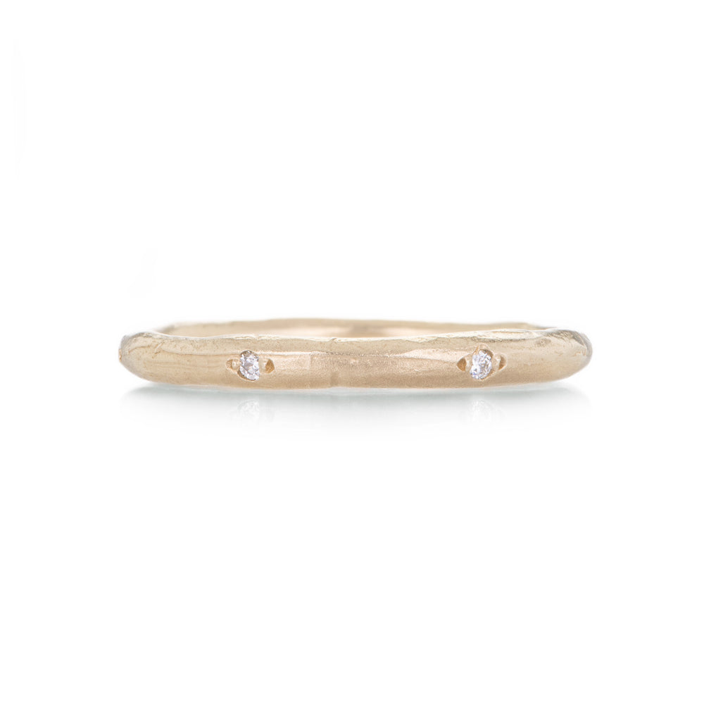 Stack up the delicate love in this 14k yellow gold band from Victoria Cunningham. The satin finish and organic form sparkles with six bead set white diamonds. Size 6.5. Handcrafted in Los Angeles, CA, U.S.
