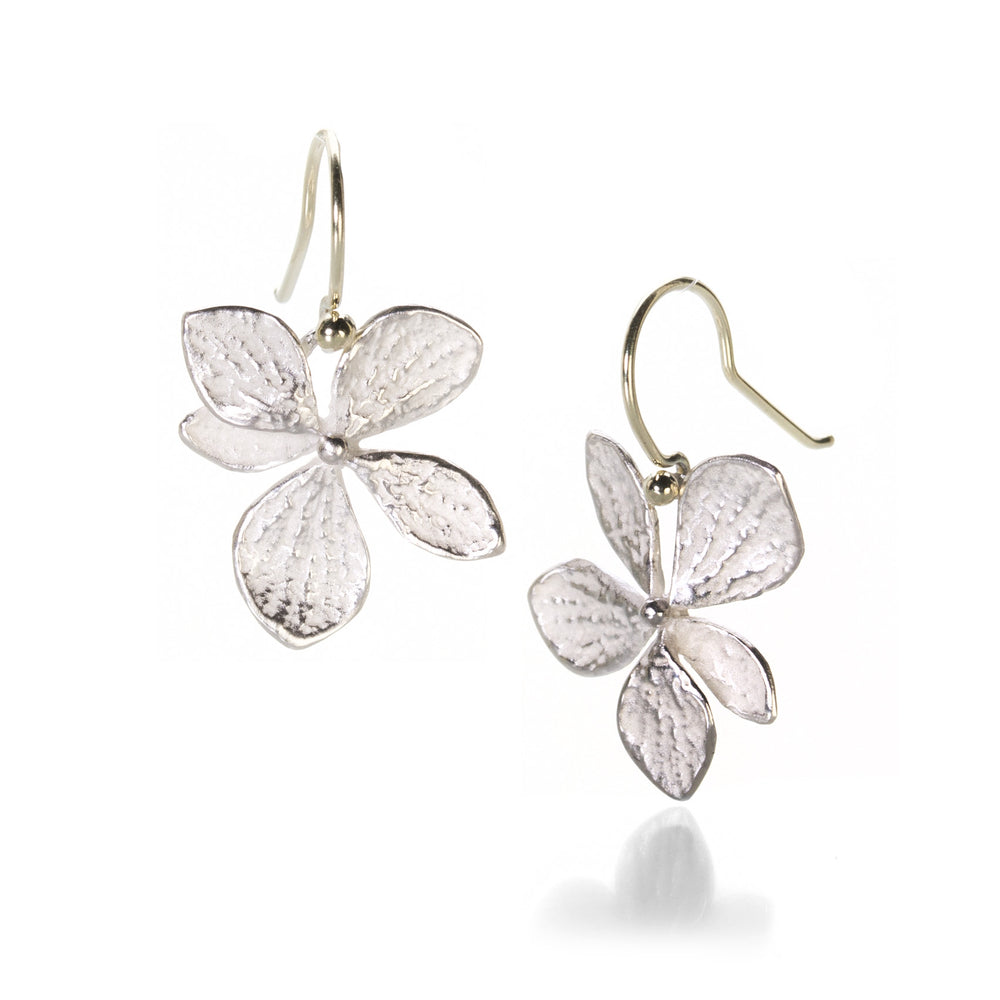 A pair of John Iversen earrings is sure to delight all who happen upon them! These bright sterling silver, nature-cast hydrangea blooms are as vibrant as the day they were picked. Hanging lightly from 18k yellow gold ear wires, their total length measures 1". Handcrafted in East Hampton, NY, U.S.