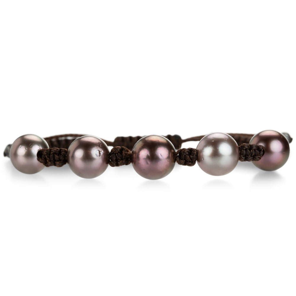 Wondrous, regal and unique, the warm tones in this Gellner pearl bracelet make a fabulous addition to your casually elegant jewelry collection. A simple deep brown adjustable macramé cord is strung with five 10-11mm Tahitian pearls and two black rhodium plated sterling silver beads on the cord tails. Dress up your jeans with some coastal vibes! Handcrafted in Germany.
