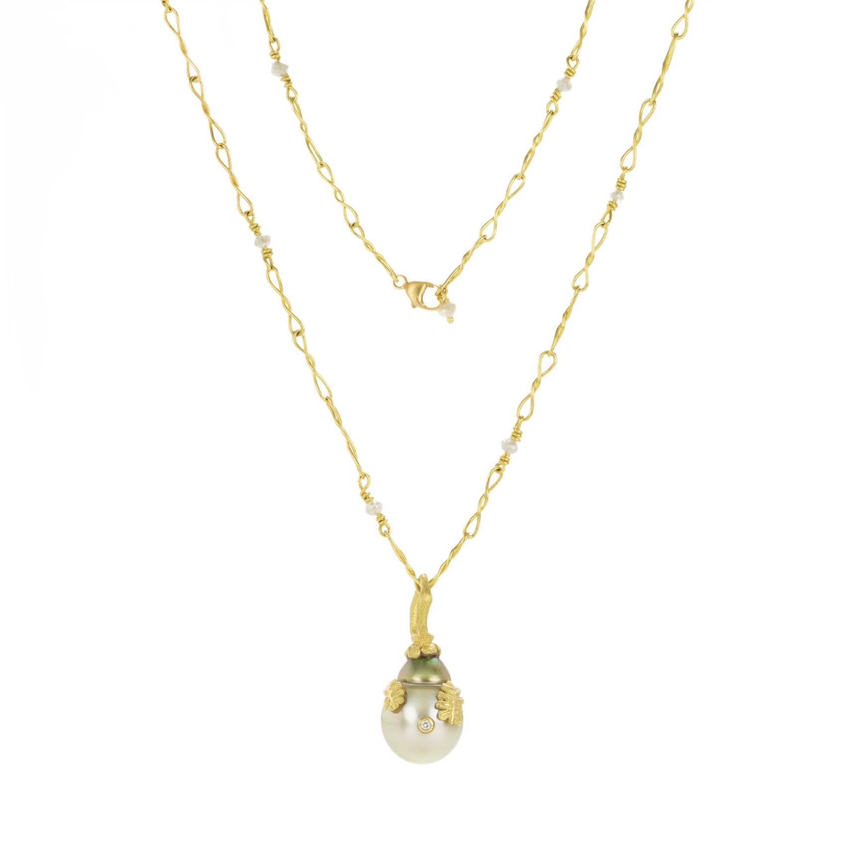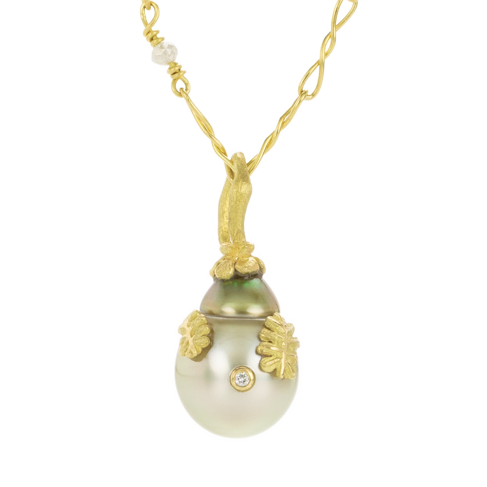 An elegant marriage of land and sea, this 18k yellow gold pendant from Lene Vibe features a silvery gray Tahitian pearl with two small carved leaves and a single bezel set 0.01ct diamond. Total length measures 1" including bail. Pendant only, chain is sold separately. Handcrafted in Denmark.