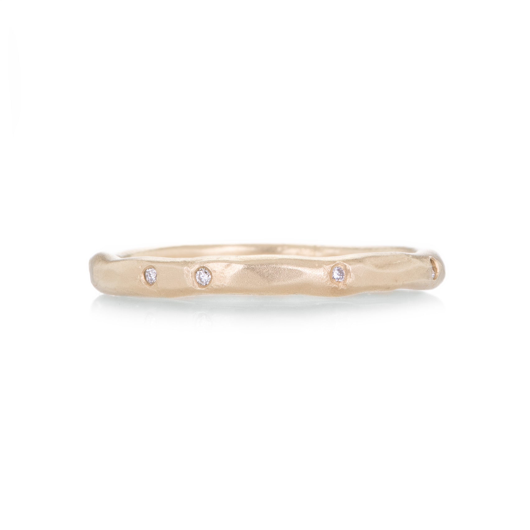 Stack up the delicate love in this 14k yellow gold band from Victoria Cunningham. The satin finish and organic form sparkles with ten bead set white diamonds all around. Size 6. Handcrafted in Los Angeles, CA, U.S.