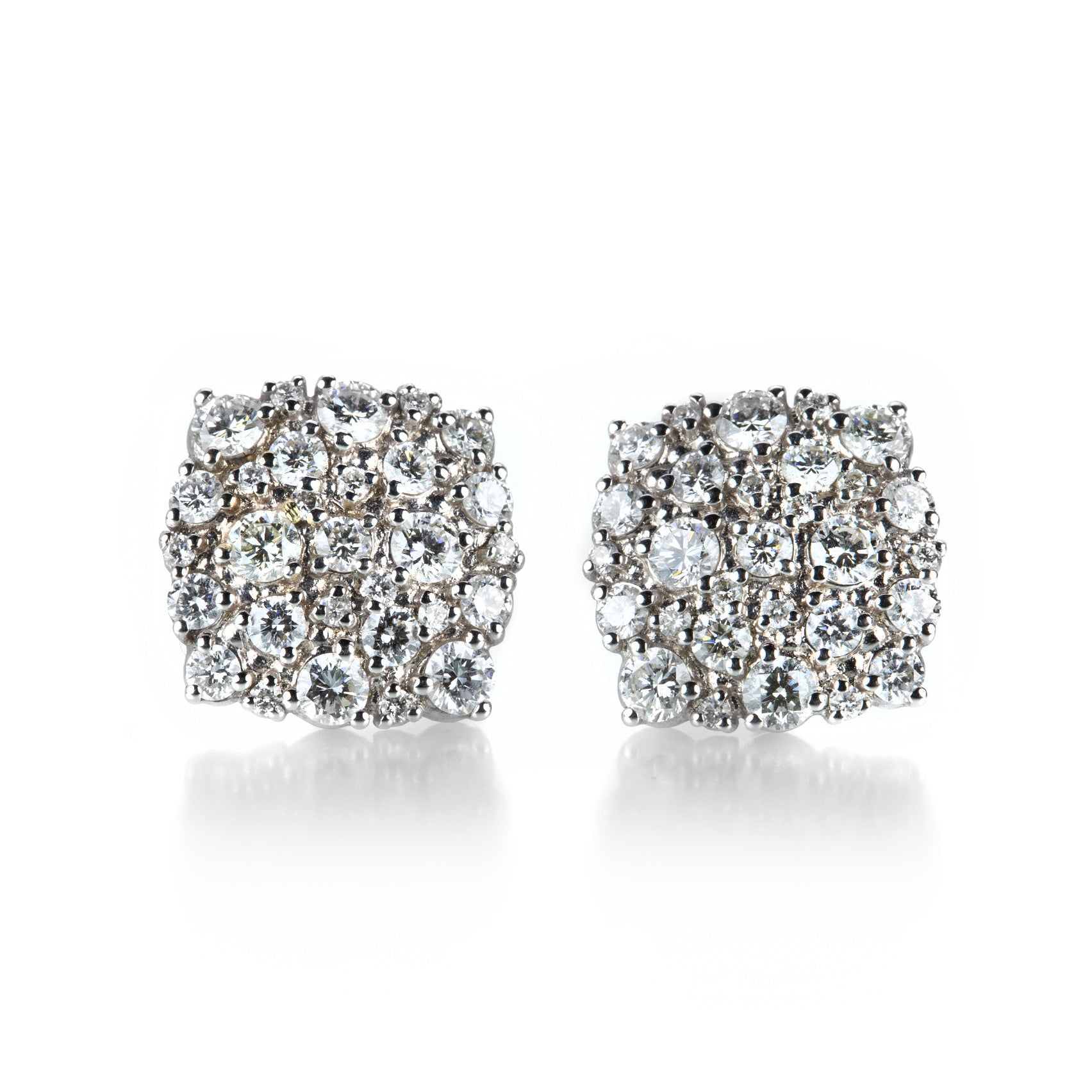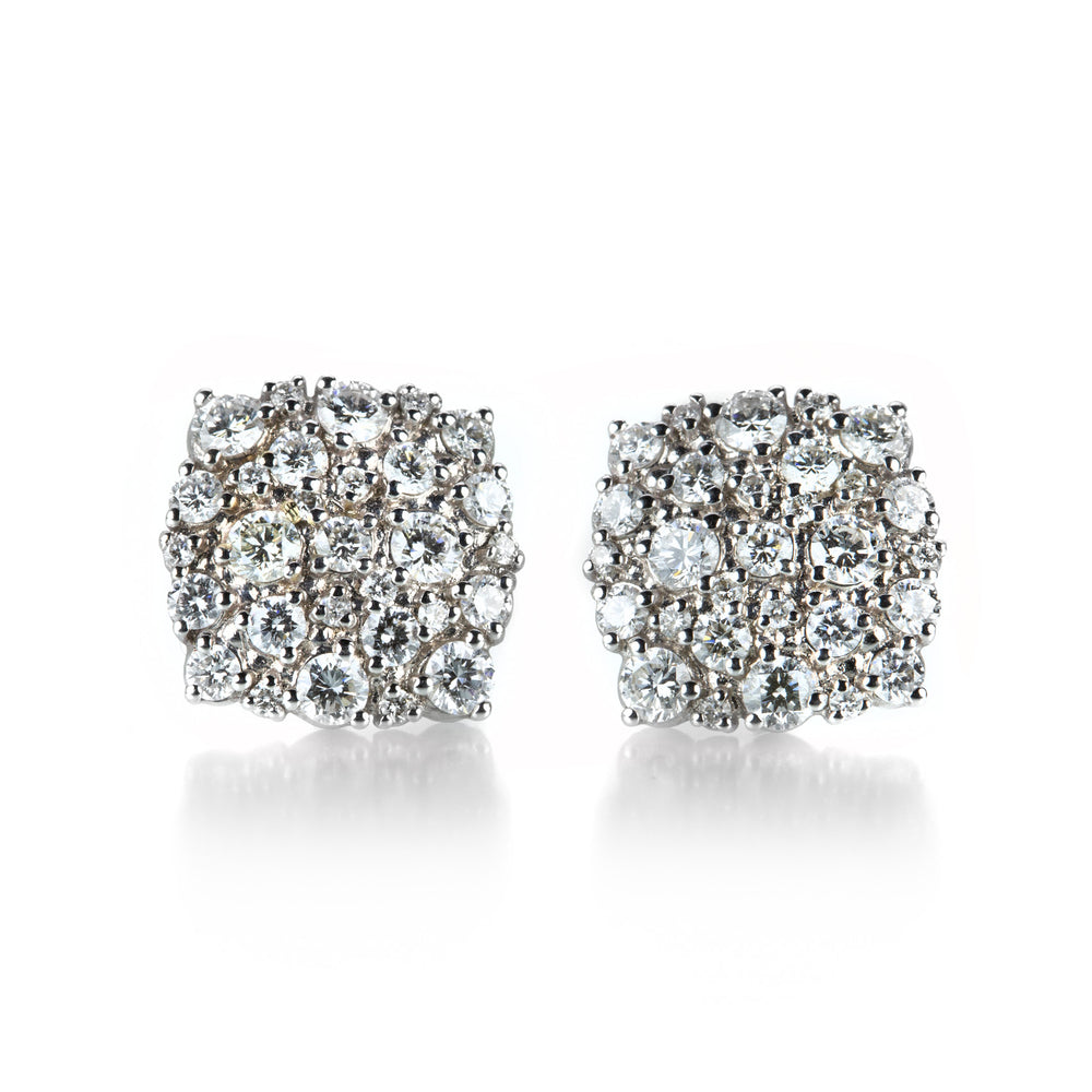 These 18k white gold cushions are encrusted with Paul Morelli's diamond confetti, totaling 1.74cttw. The glittering white diamonds of various size and shape create quite a flash mob! Studs measure 1/2" x 1/2". Handcrafted in Philadelphia, PA, U.S.